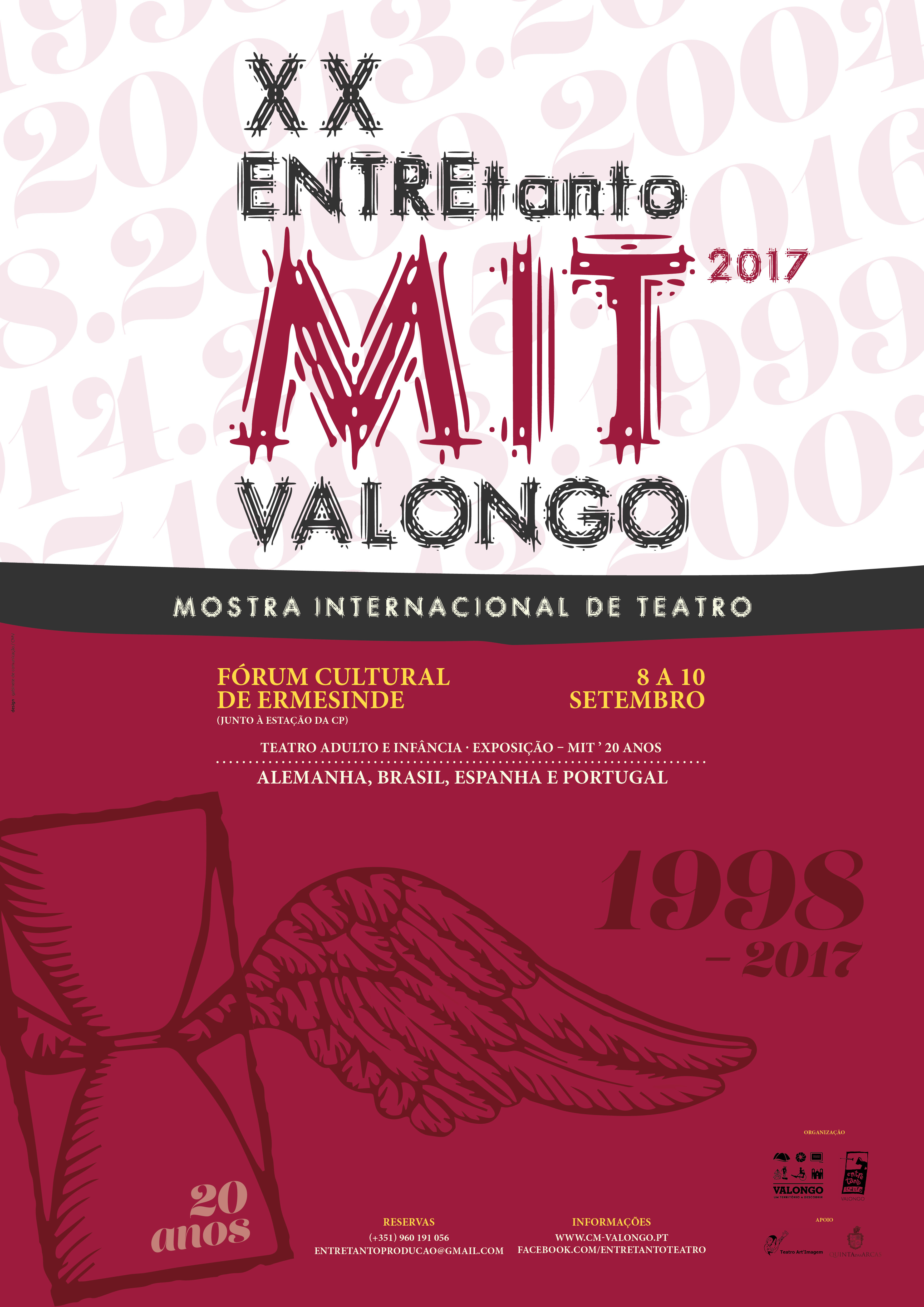 O ENTREtanto MIT Valongo – Mostra Internacional de Teatro - 2017, coorganizado desde 1998 pelo ENTREtanto TEATRO e pela Câmara Municipal de Valongo, pretende contribuir para a difusão da atividade teatral nacional e internacional em Valongo e área metropolitana do Porto.