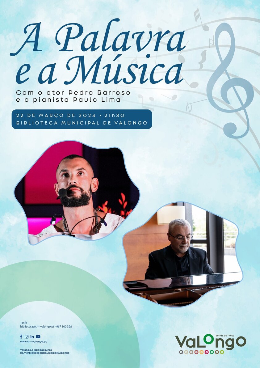 No dia 22 de março, pelas 21h30, a Biblioteca Municipal de Valongo recebe o espetáculo "A palavra e a música". Em palco estará o ator Pedro Barroso, acompanhado pelo pianista Paulo Lima, numa performance que junta duas artes que se fundem e que se complementam.