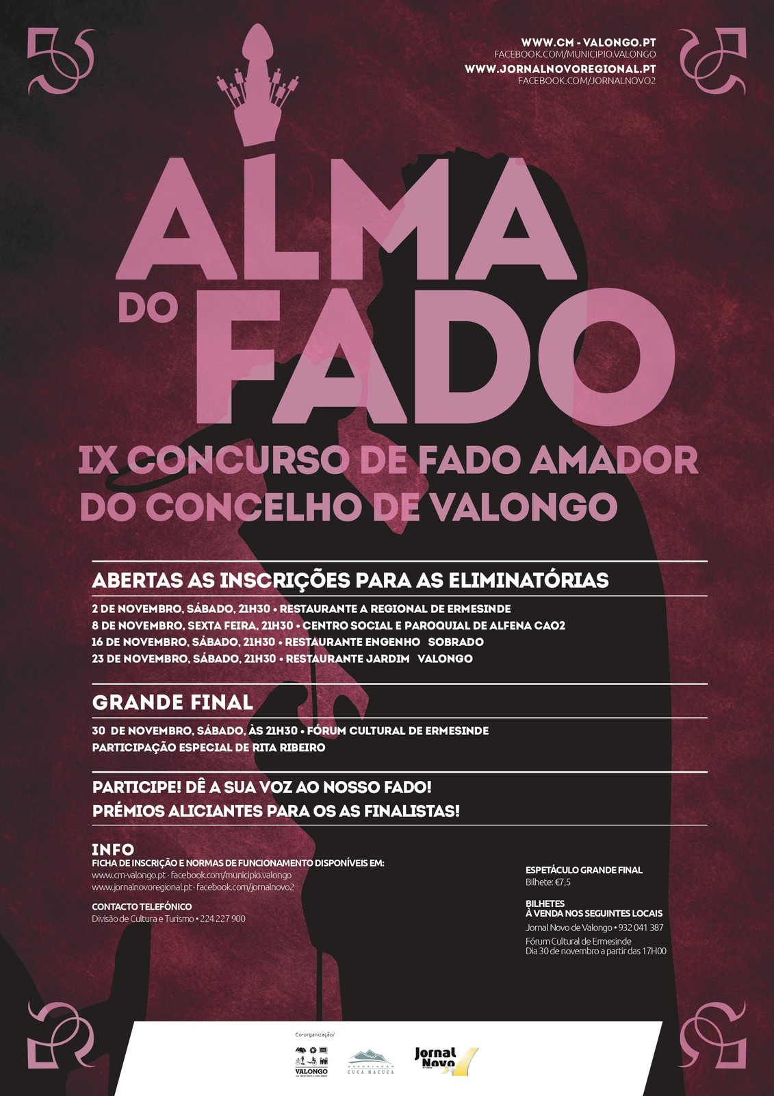 As inscrições podem ser efetuadas desde já e para mais pormenores podem ser contactadas a Divisão de Cultura da CM Valongo (Ilda Correia – Ilda.Correia@cm-valongo.pt ) ou o Jornal Novo Regional (Agostinho Ribeiro – 932041387 ou jornalnovoregional@gmail.com)).