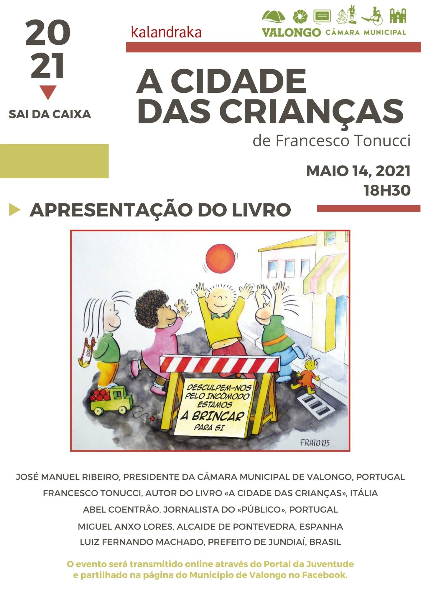 No próximo dia 14 de maio, o Município de Valongo irá acolher uma iniciativa nacional de apresentação do livro «A cidades das Crianças» do Professor Francesco Tonucci, recentemente traduzida para português pela Editora kalandraka.