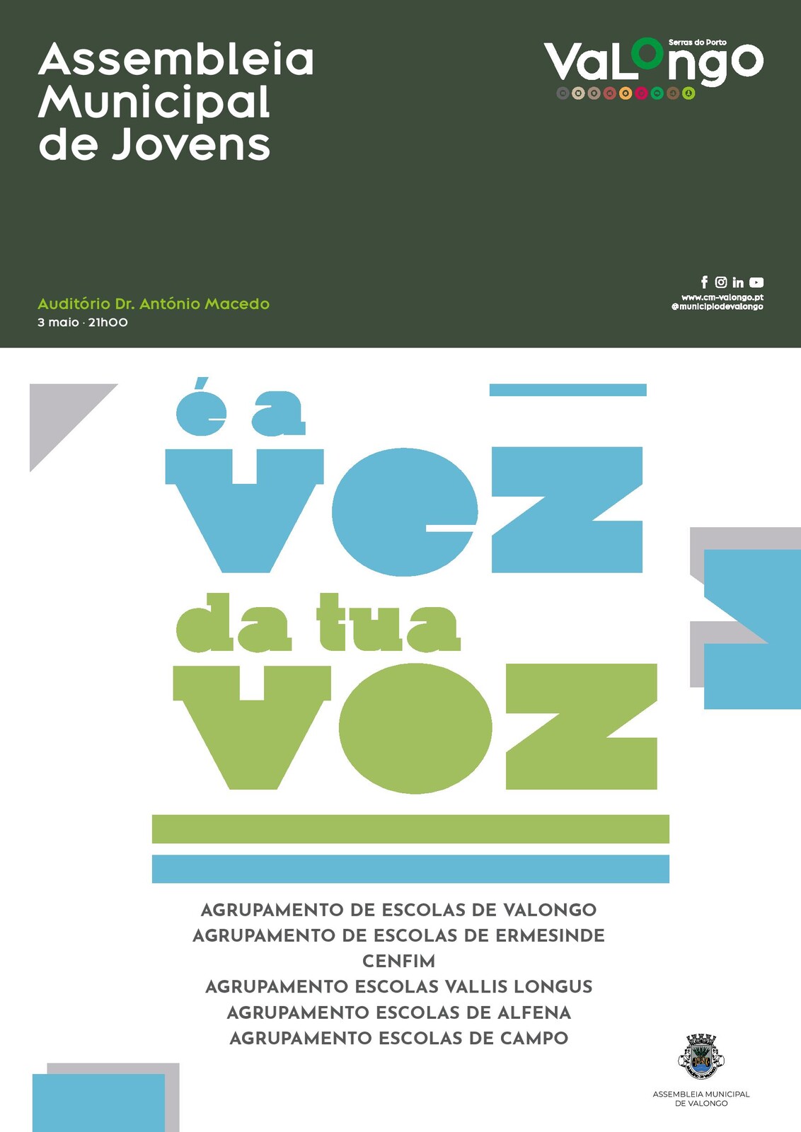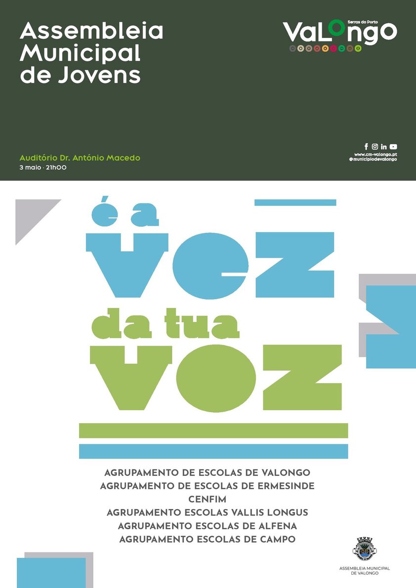 Cumprindo a tradição, no próximo dia 03 de maio, pelas 21h00, no Auditório Dr. António Macedo (CC Vallis longus), em Valongo, realiza-se mais uma sessão da Assembleia Municipal de Jovens. Sob o lema "É a vez da tua voz", dezenas de jovens irão mostrar as suas preocupações e sugestões para um cocnelho melhor. Participarão alunos do Agrupamento de Escoals de Valongo, Agrupamento de Escolas de Ermesinde, CENFIM, Agrupamento de Escolas Vallis Longus, Agrupamento de Escolas de Alfena e Agraupmento de Escoals de Campo.