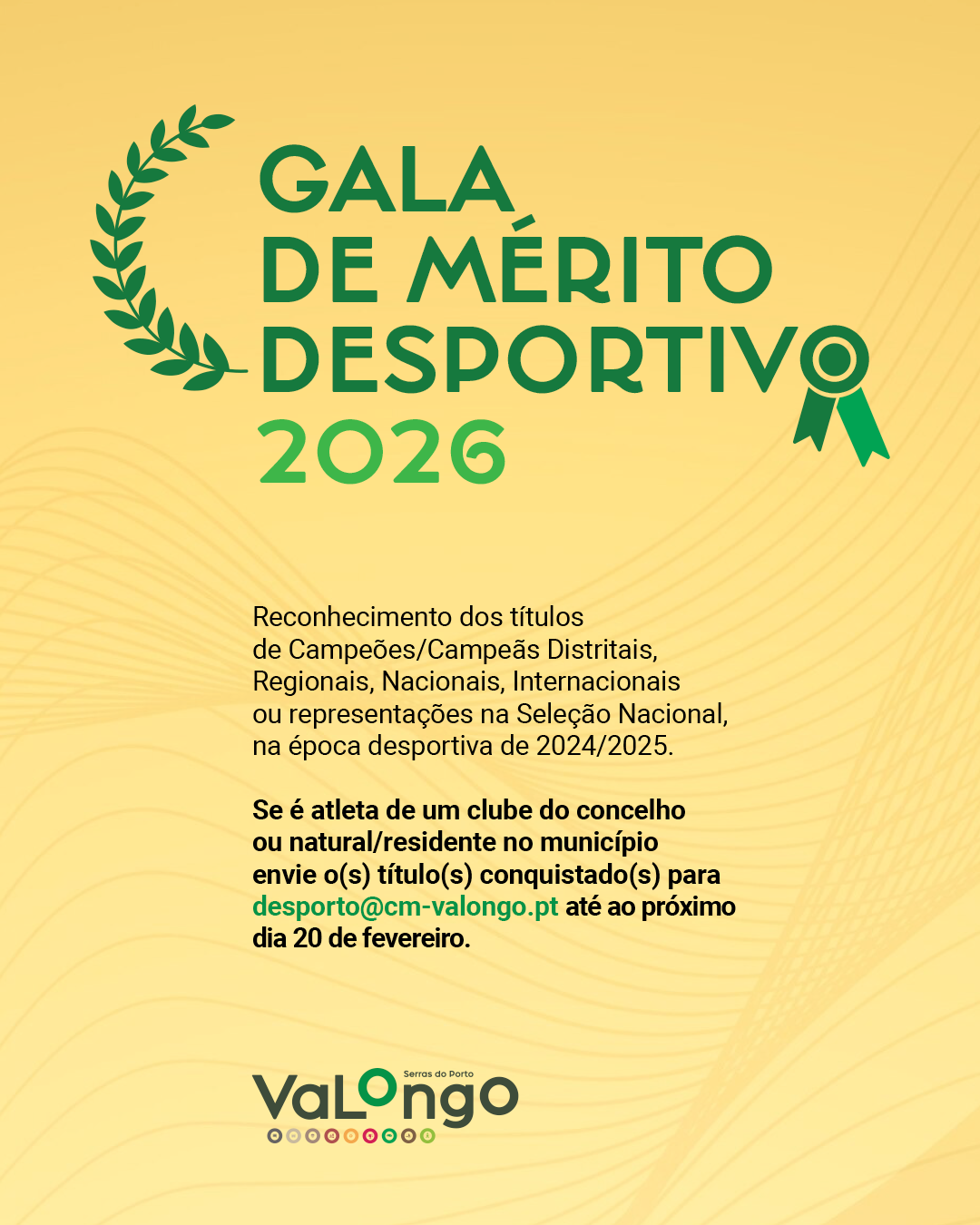 O Município de Valongo vai, como habitualmente, homenagear publicamente todos/as os/as atletas que conquistaram títulos de Campeões/Campeãs Distritais, Regionais, Nacionais, Internacionais ou representações na Seleção Nacional, ou títulos de Árbitros Nacionais e/ou Internacionais na época desportiva de 2024/2025.