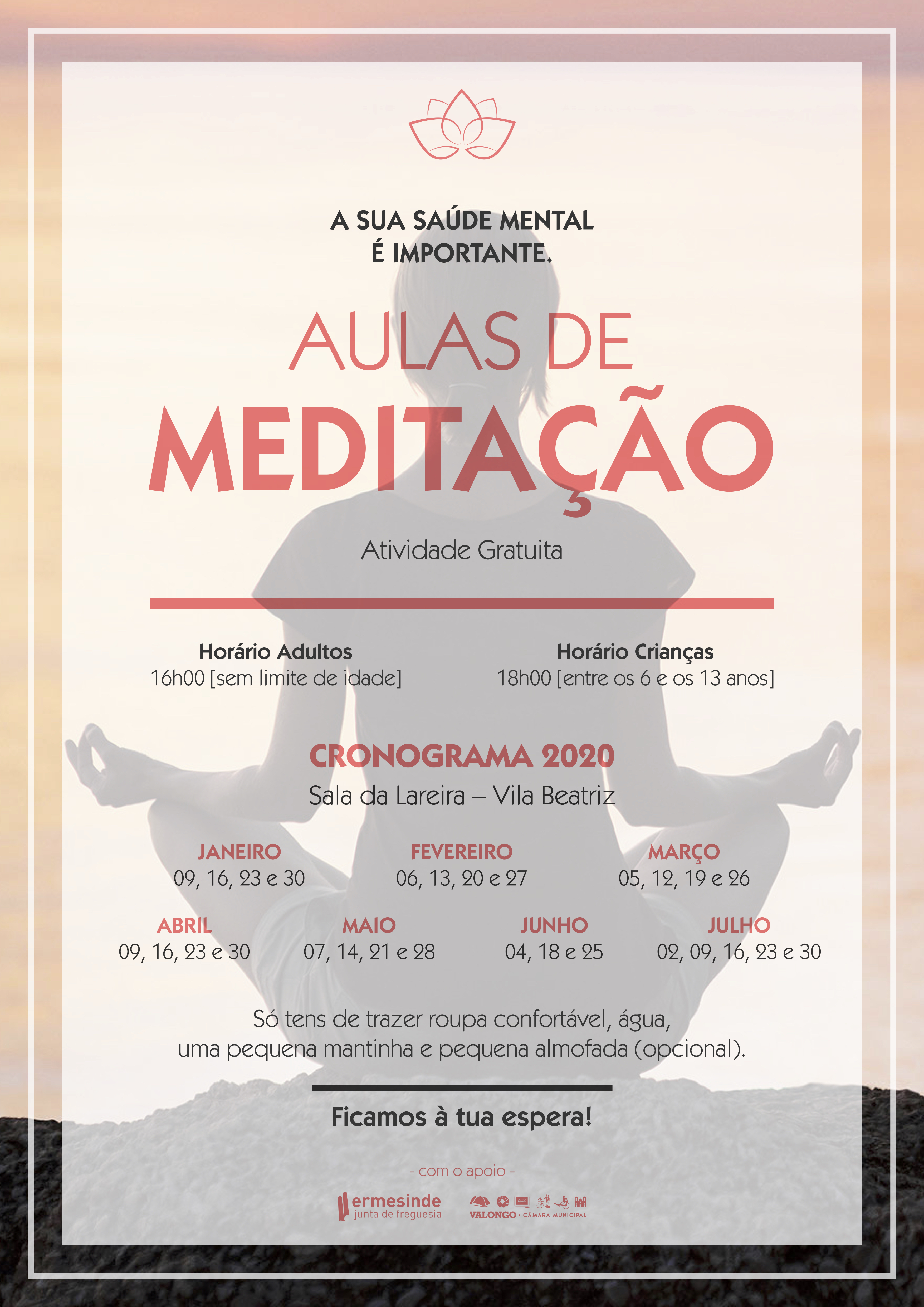 A Câmara Municipal de Valongo em parceria com a Junta de Freguesia de Ermesinde convida tod@s @s interessad@s (e curios@s!) a participarem nas Aulas de Meditação GRATUITAS, para adultos e para crianças, que se realizam às quintas-feiras, na Sala da Lareira da Vila Beatriz, em Ermesinde.