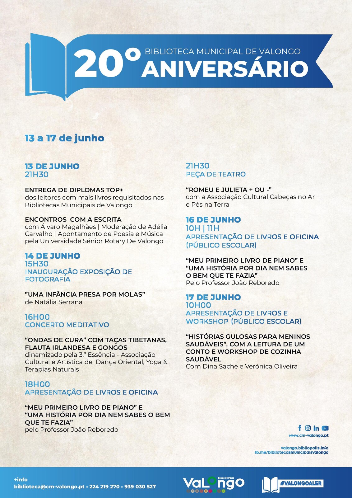 A Biblioteca Municipal de Valongo comemora 20 anos e vai assinalar a data com um vasto programa de atividades. Assim, entre 13 e 17 de junho, a Biblioteca acolhe um espetáculo de teatro, apresentação de livros, uma exposição de fotografia, um concerto meditativo e contará com a presença de Álvaro Magalhães em mais edição do Encontros com a Escrita.