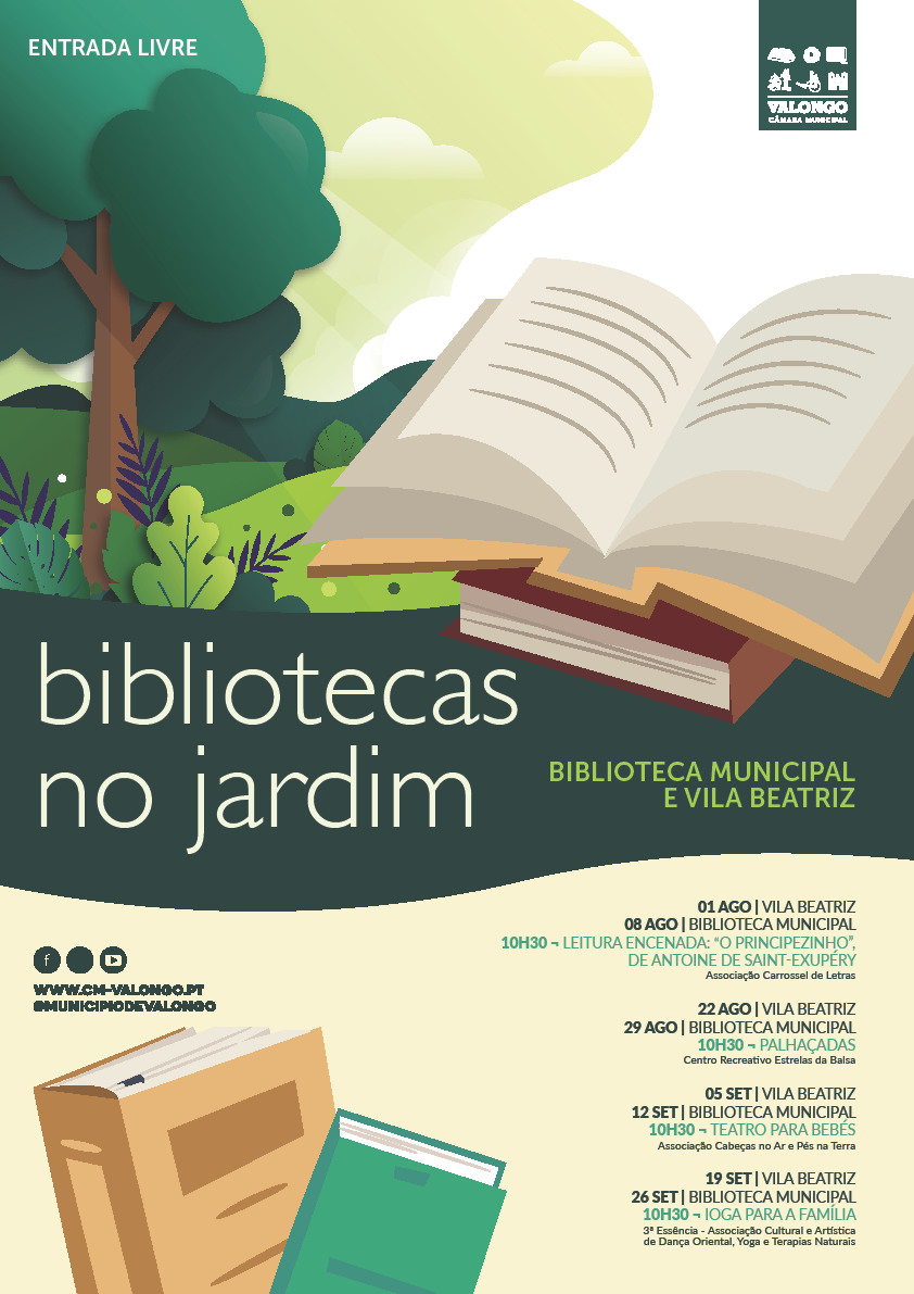 A Biblioteca Municipal de Valongo vai dinamizar um conjunto de atividades vocacionadas para os mais novos e suas famílias, durante os meses de agosto e setembro (sábados de manhãs), nos belíssimos jardins da Biblioteca Municipal e da Vila Beatriz, alternadamente, com o envolvimento de associações culturais do concelho, revitalizando os espaços ao ar livre.