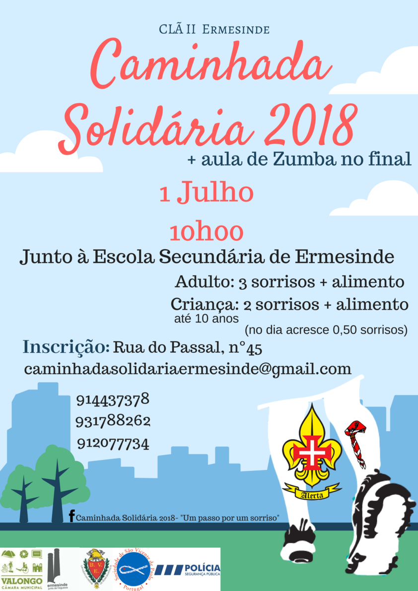 O Corpo Nacional de Escutas - Agrupamento 7 (Ermesinde) realizará, com o apoio do Município de Valongo, uma Caminhada Solidária intitulada "Um passo por um sorriso", no próximo dia 1 de julho, com partida prevista para as 10h00, na Rua D. António Ferreira Gomes (junto à Escola Secundária de Ermesinde) e chegada na Avenida D. António Ferreira Gomes (próximo da Junta de Freguesia de Ermesinde), com um percurso de cerca de 6 Km e dirigida à população em geral, prevendo-se um total de 400 participantes.