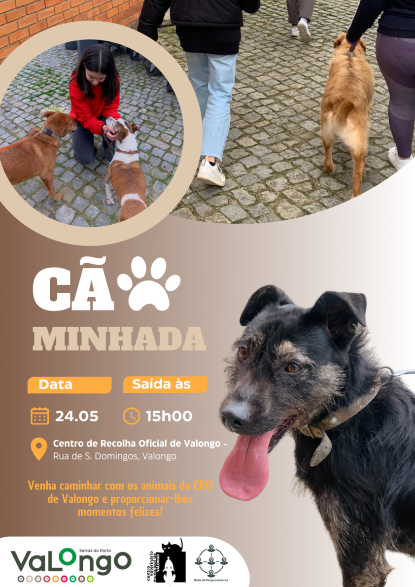 No âmbito do projeto "Rede de Perguntadores", realiza-se no próximo dia 24 de maio, a partir das 15h, uma "CãoMinhada" que consiste num passeio de aproximadamente uma hora com alguns animais do Centro de Recolha Oficial de Valongo. Para além de permitir o convívio entre voluntários e animais, esta iniciativa tem como objetivo sensibilizar a população para a importância da adoção dos animais que se encontram no Centro.