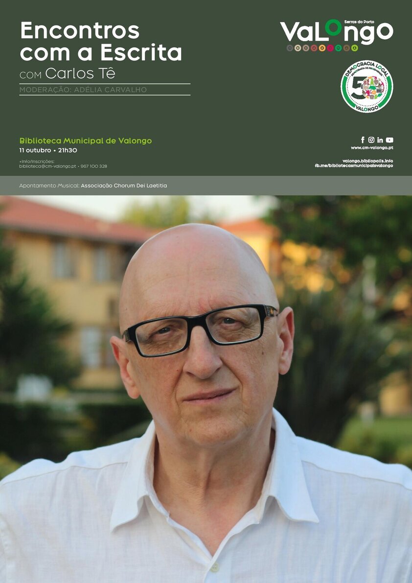 No dia 11 de outubro, pelas 21h30, o autor de inúmeros sucessos musicais, como "Chico Fininho", por exemplo, estará na Biblioteca Municipal de Valongo para uma conversa moderada por Adélia Carvalho. O encontro com Carlos Tê será precedido de um curto apontamento musical que ficará a cargo da Associação Chorum Dei Laetitia.