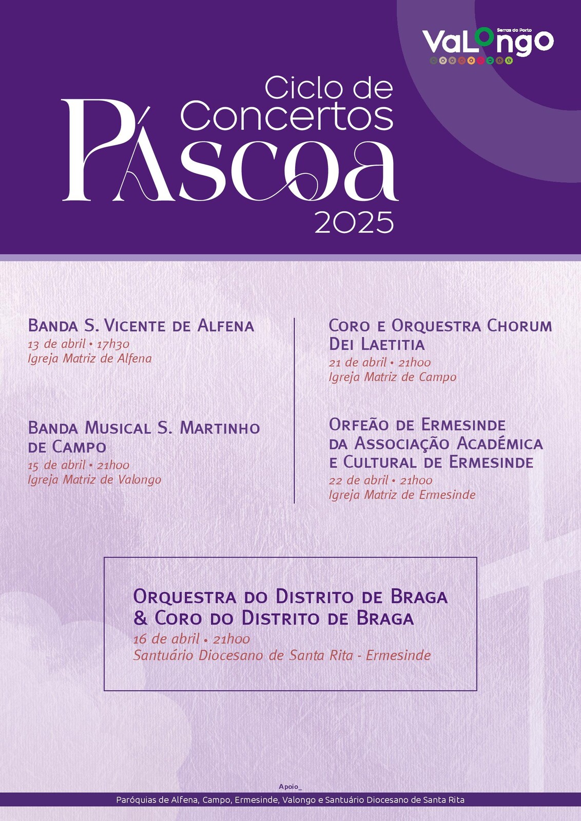 O habitual Concerto de Páscoa promovido pelo Município de Valongo vai dar lugar a um ciclo de concertos que, entre 13 e 22 de abril, vai percorrer cinco igrejas de 4 freguesias do concelho.
