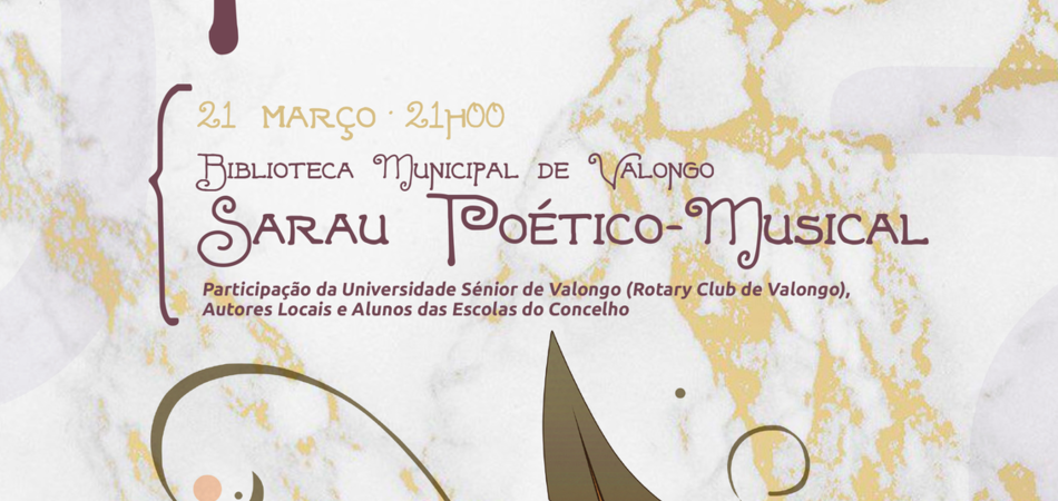 21 MARÇO | 21H00 - Sarau Poético-musical. Declamação de poemas, intercalados por breves apontamentos musicais, numa interação entre poetas já com obra publicada e jovens/autores, amantes deste género literário. Com a participação da Universidade Sénior de Valongo, autores/as locais e estudantes das escolas do concelho.