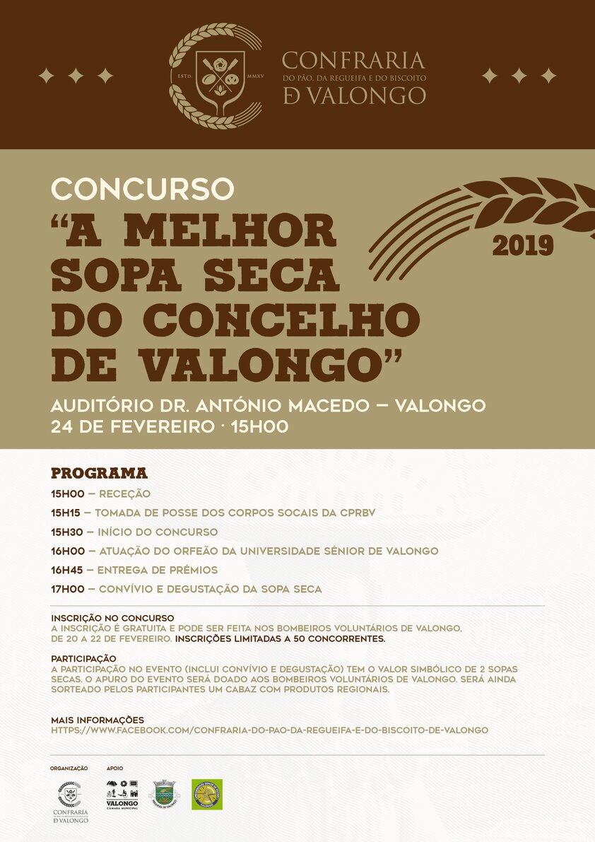 No próximo dia 24 de fereiro, pelas 15h00, o Auditório António Macedo, em Valongo, vai acolher mais uma edição do concurso "A melhor sopa seca do concelho de Valongo. Promovida pela Confraria do Pão, da Regueifa e do Biscoito de Valongo, com o apoio da Câmara Municipal de Valongo, esta iniciativa tem um cariz solidário uma vez que o valor angariado reverterá para os Bombeiros Voluntários de Valongo.