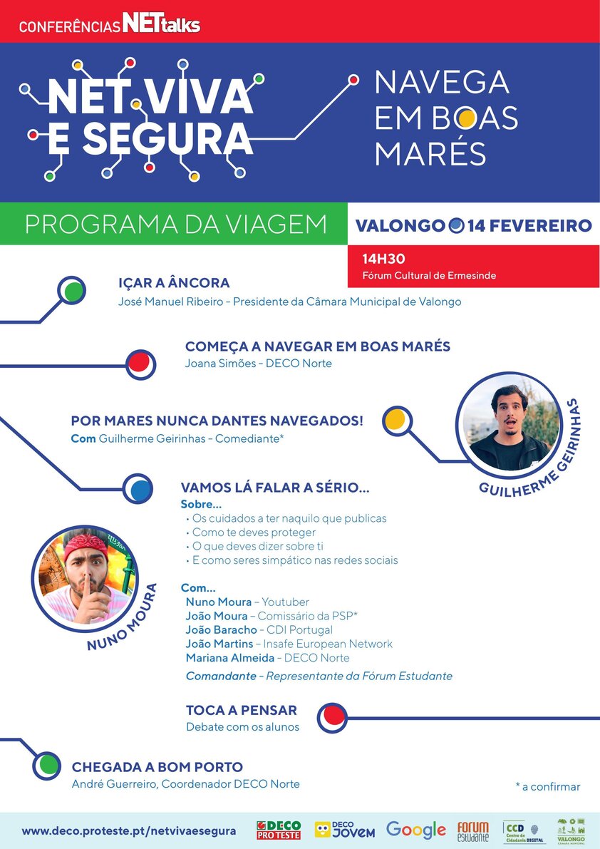 A DECOJovem, com o apoio da Google Portugal, Câmara Municipal de Valongo e o Centro de Cidadania Digital do concelho, vai promover a Conferência NETtalks – NET Viva e Segura – Navega em boas marés! – Trata-se de uma iniciativa nacional que convida a comunidade educativa , neste caso, do concelho de Valongo, a refletir sobre a importância de adotar comportamentos mais seguros e em respeito pela privacidade dos seus dados pessoais, no acesso à Internet e em especial nas redes sociais.