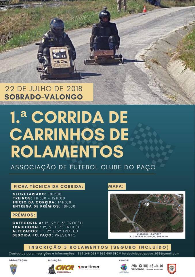 No âmbito das comemorações do seu 59.º Aniversário, o Futebol Clube do Paço, com o apoio do Município de Valongo, vai organizar a 1.ª Corrida de Carrinhos de Rolamentos, no dia 22 de julho. Esta iniciativa decorrerá junto à EB do Paço, em Sobrado, com os treinos a decorrerem pelas 11h00, a prova às 14h00 e a entrega de prémios pelas 18h00.