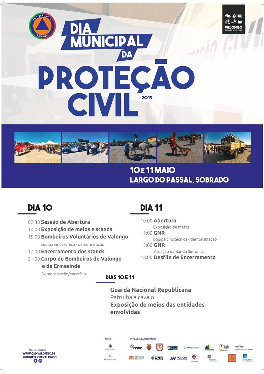 Em 2019, o Dia Municipal da Proteção Civil comemora-se nos dias 10 e 11 de maio, no Largo do Passal, em Sobrado.