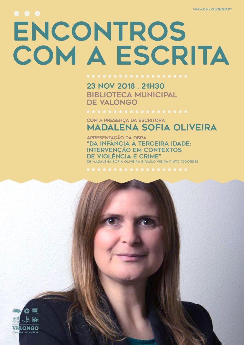 No próximo dia 23 de novembro, pelas 21h30, a Biblioteca Municipal de Valongo dinamiza mais uma sessão de "Encontros com a Escrita", desta vez com Madalena Sofia Oliveira, com apresentação da sua mais recente obra “Da infância à terceira idade: intervenção em contextos de violência e crime - guia prático para estudantes e profissionais” de Madalena Sofia Oliveira e Paulo Vieira Pinto (Coords.).