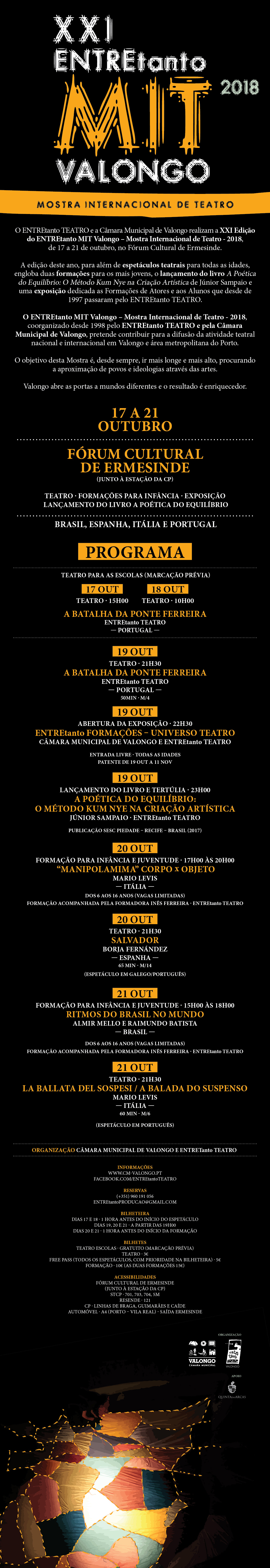 O ENTREtanto MIT Valongo – Mostra Internacional de Teatro - 2018, coorganizado desde 1998 pelo ENTREtanto TEATRO e pela Câmara Municipal de Valongo, pretende contribuir para a difusão da atividade teatral nacional e internacional em Valongo e área metropolitana do Porto.