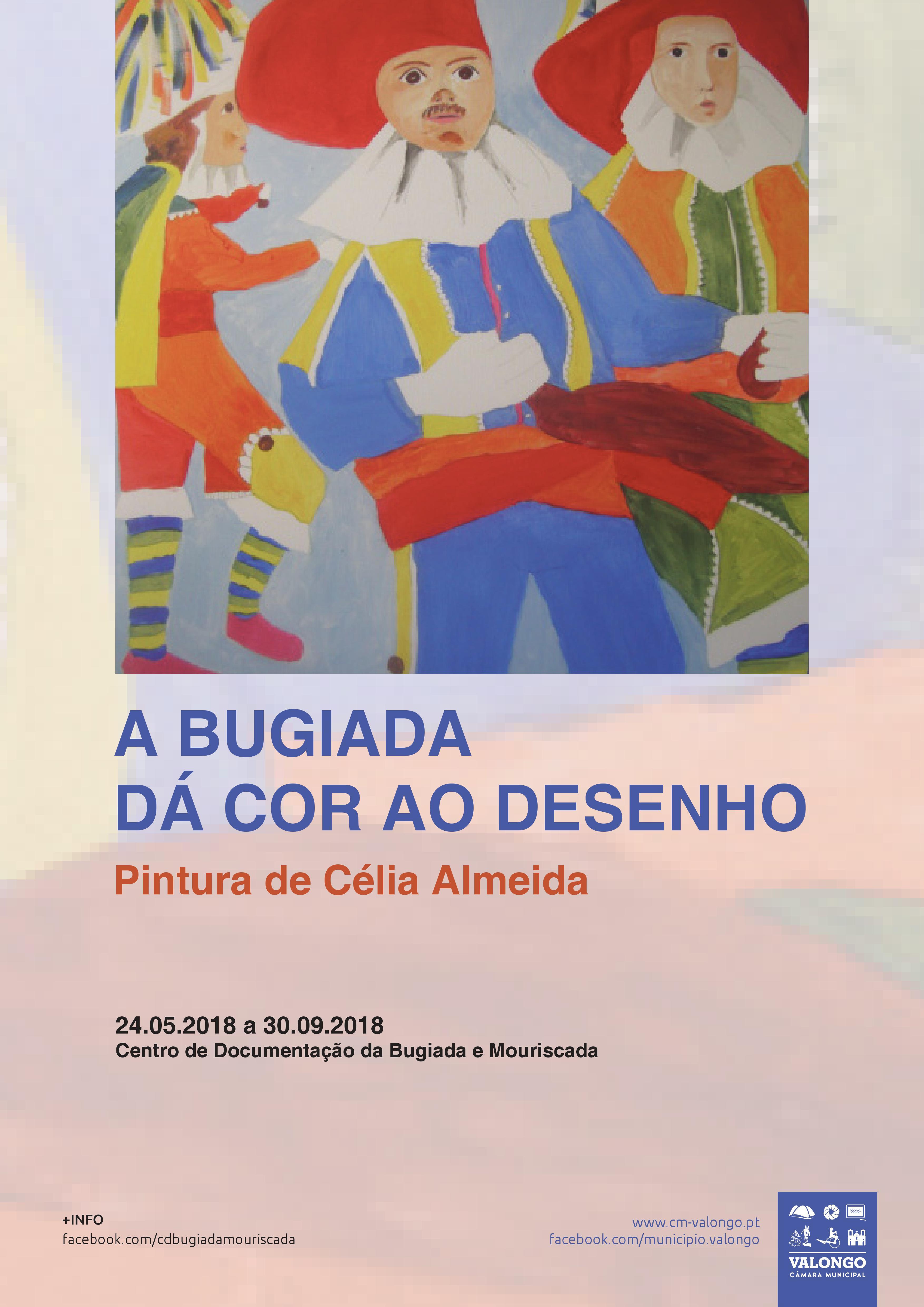 Célia Almeida é arquiteta de formação e autodidata na pintura. A dezena de telas que expõe são o resultado da aplicação das cores nos desenhos inspirados nas personagens da festa, os Bugios e os Mourisqueiros.