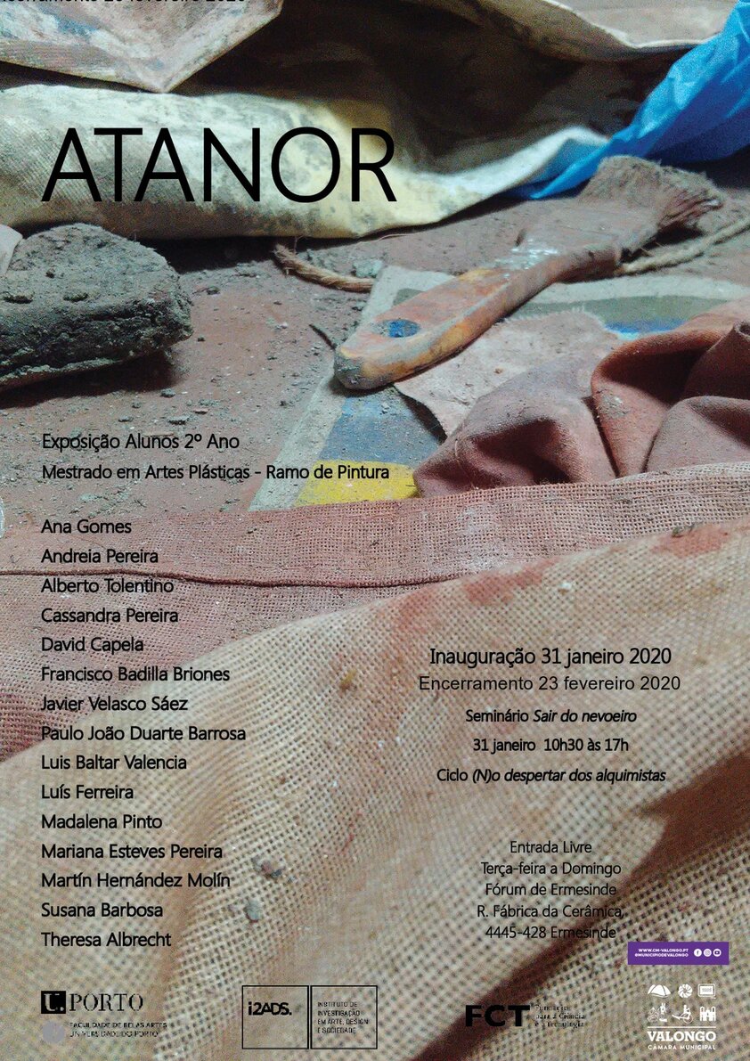 A Exposição intitulada “Atanor”, desenvolvida no âmbito do segundo ano de Mestrado em Artes Plásticas da Faculdade de Belas Artes da Universidade do Porto inaugura dia 31 de janeiro pelas 21:30, no Fórum Cultural de Ermesinde e estará patente até ao dia 23 de fevereiro. Esta mostra é resultado do trabalho efetuado pelos alunos Ana Gomes, Andreia Pereira, Alberto Tolentino, Cassandra Pereira, David Capela, Francisco Badilla Briones, Javier Velasco Sáez, João Barros, Luís Baltar Valencia, Luís Ferreira, Madalena Pinto, Mariana Esteves Pereira, Martín Hernández Molín, Susana Barbosa, Theresa Albrecht, sob a orientação do Professor Domingos Loureiro,