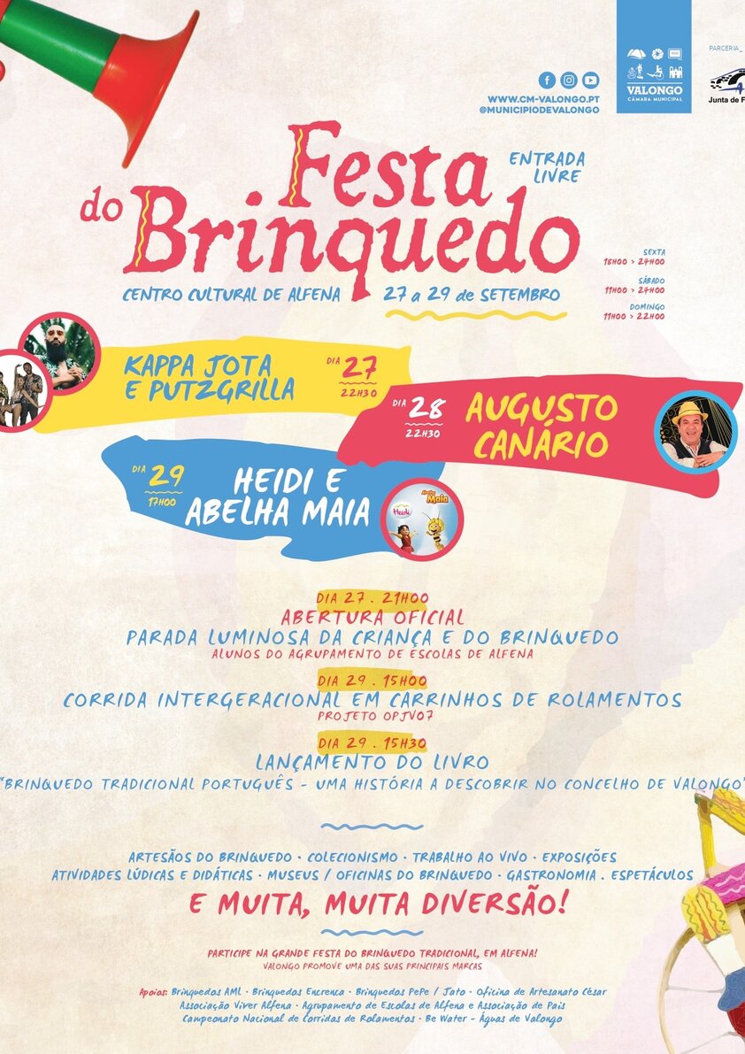 A Festa do Brinquedo realiza-se de 27 a 29 de setembro, no Centro Cultural de Alfena e área envolvente, este ano numa extensão ainda mais alargada, para receber milhares de pessoas de diferentes gerações com a magia e o encanto das brincadeiras de antigamente. Promovida pela Câmara Municipal de Valongo em parceria com a Junta de Freguesia de Alfena, a Festa do Brinquedo é um grande evento organizado para a preservar, valorizar e divulgar o brinquedo tradicional enquanto património identitário do concelho de Valongo, reforçando-se assim a estratégia de afirmação não só na região, mas também no País e no Noroeste Peninsular.