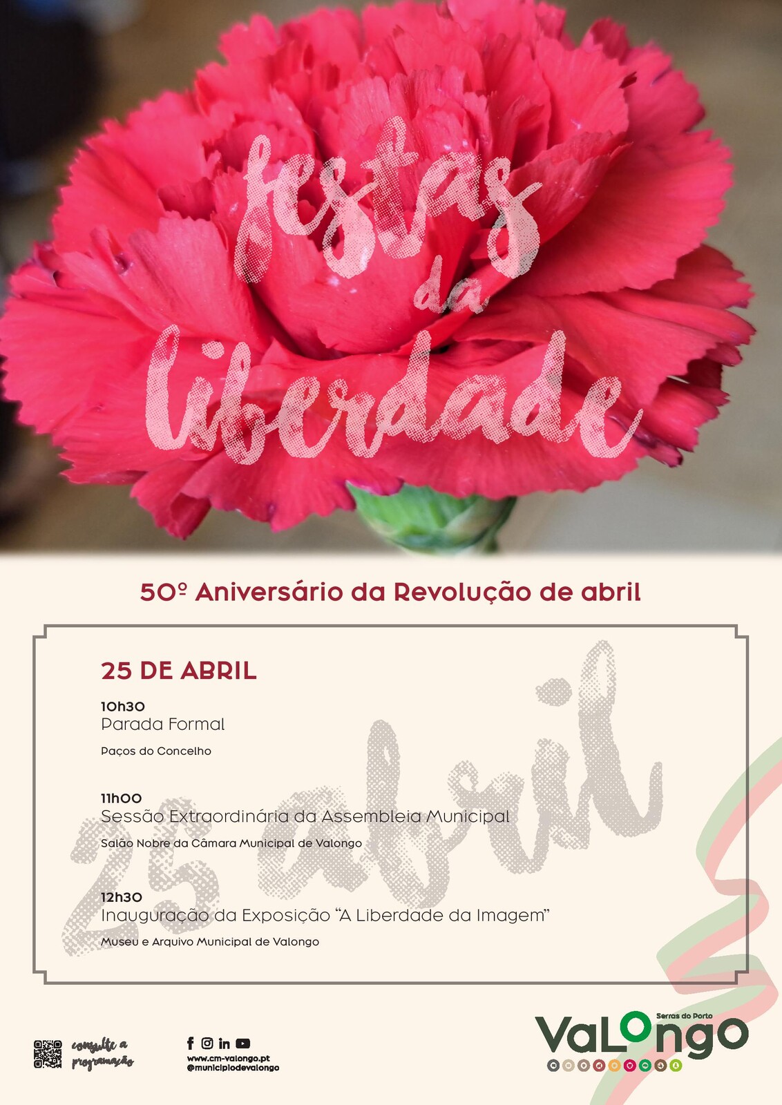 Assim, pelas 10h30 decorrerá a Parada Formal nos Paços do Concelho, sendo que 30 minutos depois realiza-se uma Sessão Extraordinária da Assembleia Municipal no Salão Nobre da Câmara Municipal de Valongo. Para terminar, às 12h30, no Museu e Arquivo Municipal será inaugurada a Exposição “A Liberdade da Imagem”.