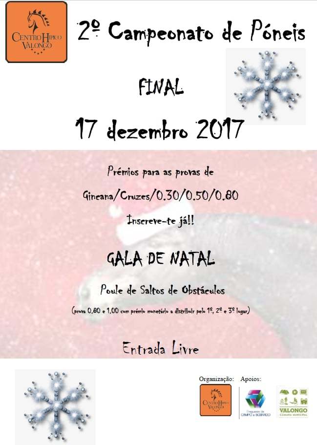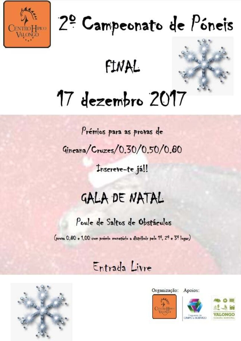 Dia 17 de dezembro, pelas 09h30, irá decorrer a final do 2º Campeonato de Póneis. Em simultâneo irá decorrer a Gala de Natal CHV - Poule de Saltos de Obstáculos.