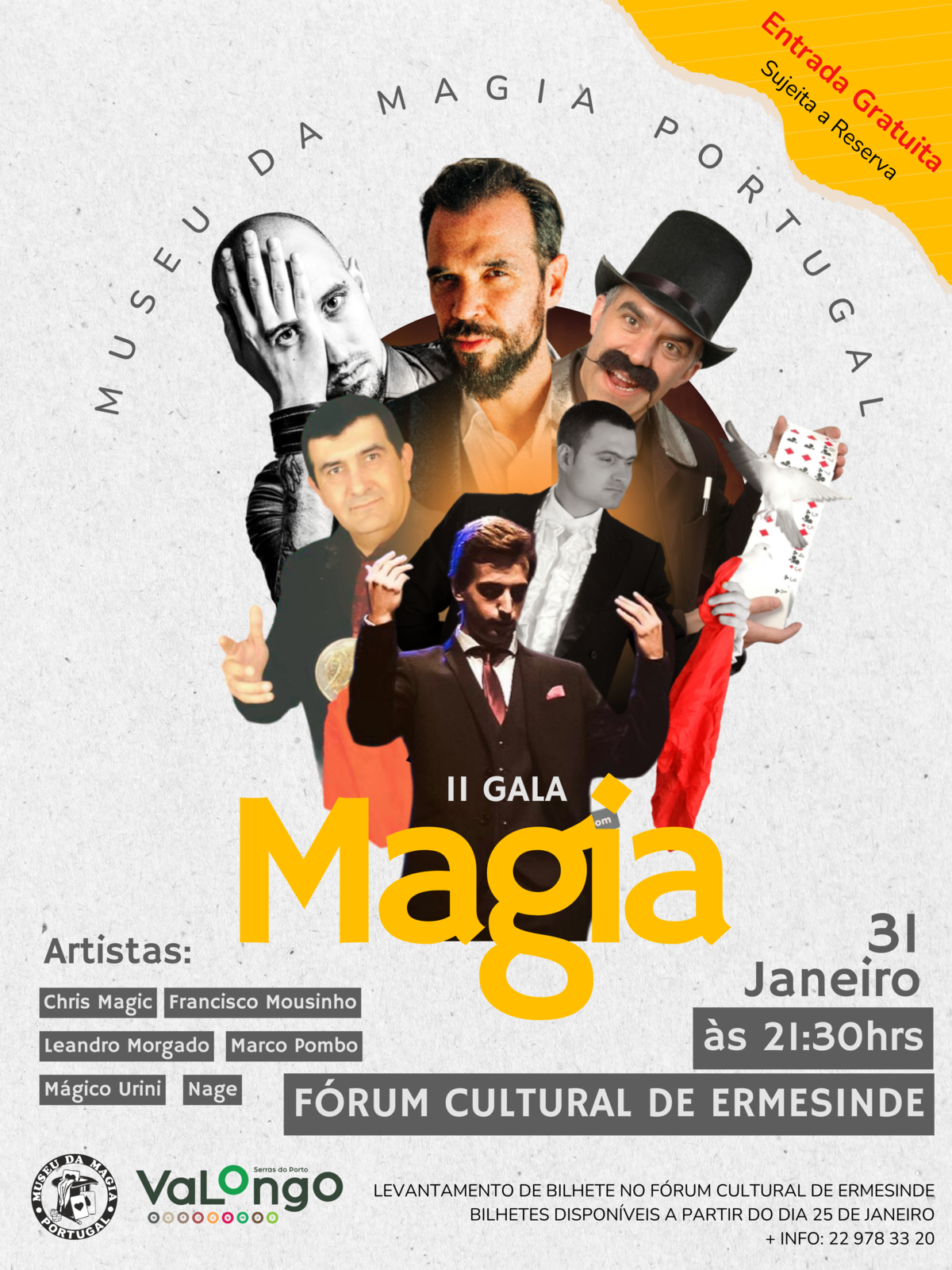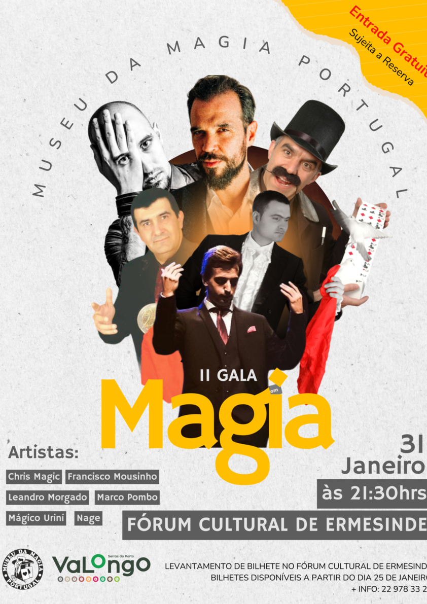 A magia está de volta a Ermesinde com a realização da II Gala de Magia do Museu da Magia de Portugal que decorrerá no dia 31 de janeiro, pelas 21h30, no Fórum Cultural. No dia do Mágico, nada melhor do que reunir um conjunto de ilusionistas nacionais de grande prestigio e proporcionar uma noite de ilusão e mistério.