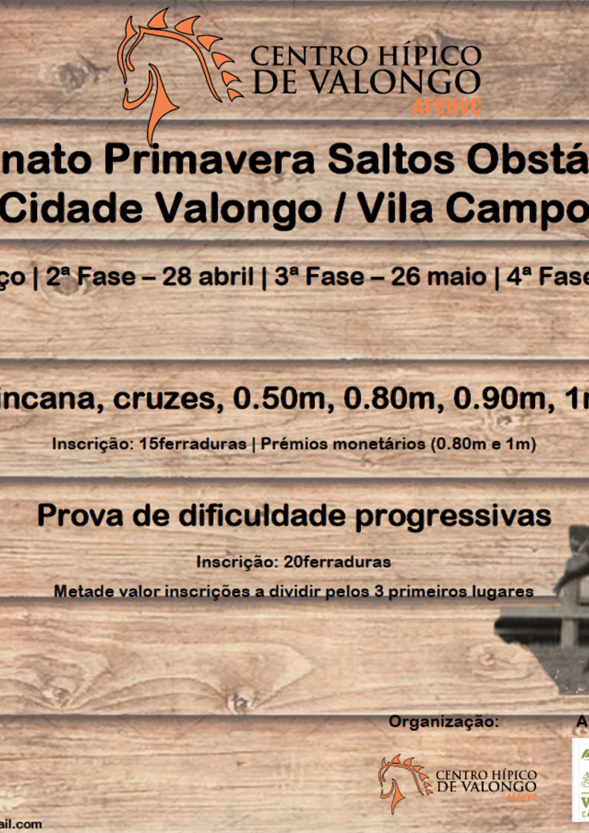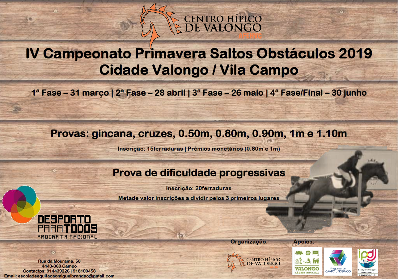 A Academia de Formação Equestre e Hipoterapia de Valongo e Campo, com o apoio do Município de Valongo, irá levar a efeito o IV Campeonato Primavera Saltos Obstáculos 2019, envolvendo provas de gincana, cruzes, 0.80m, 0.90m, 1.00m e 1.10m, com a participação de atletas de todo o país.