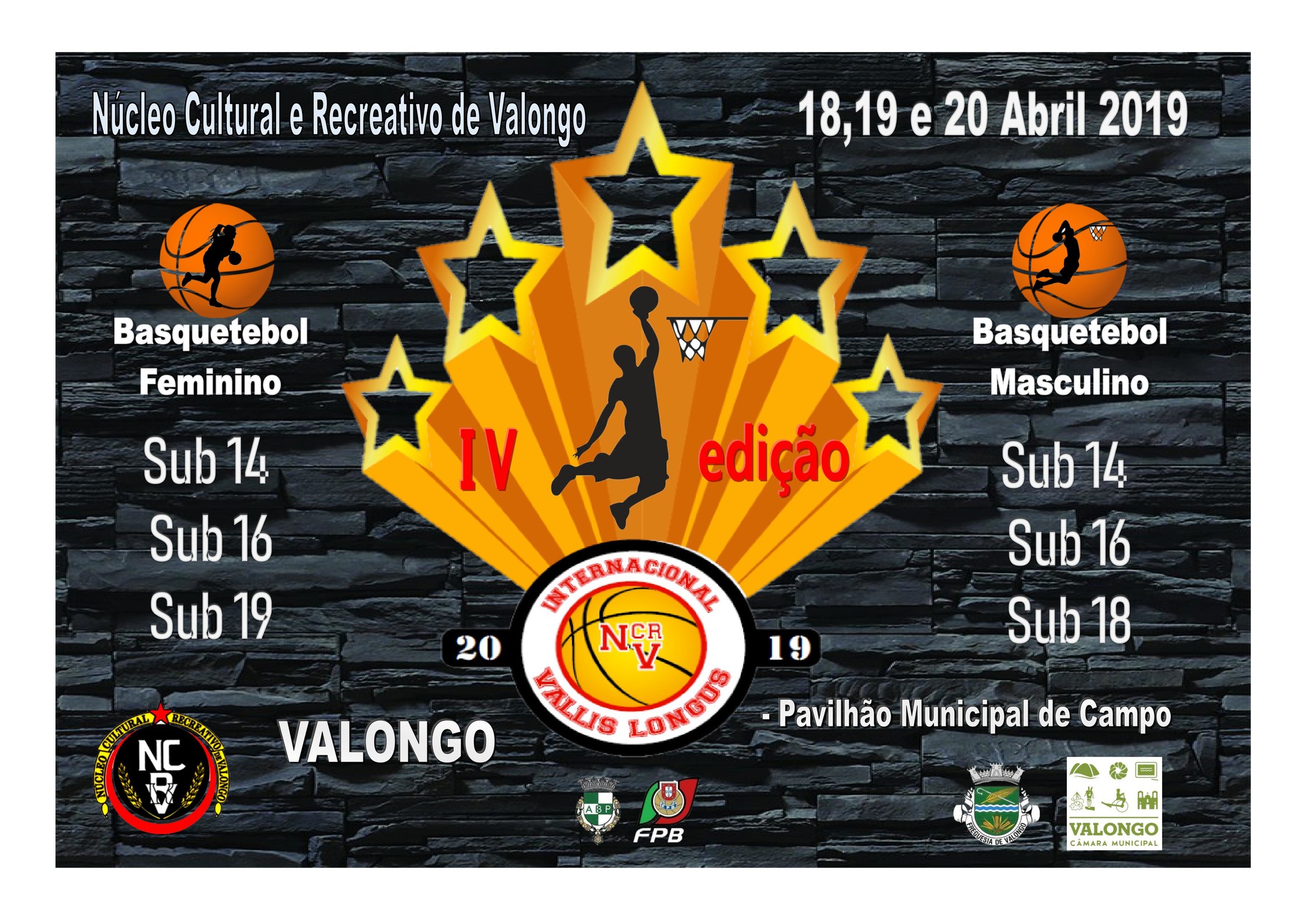 O Núcleo Cultural e Recreativo de Valongo, com o apoio do Município de Valongo, irá realizar o IV Torneio Internacional de Basquetebol Vallis Longus 2019, nos dias 18, 19 e 20 de abril, nos Pavilhões Municipais n.º1 e n.º 2 de Campo, tendo como principal objetivo a dinamização da modalidade. Irá envolver cerca de 30 equipas de diversos pontos do país e Espanha, dos escalões sub14, sub16 e sub 18 masculino e sub19 feminino.