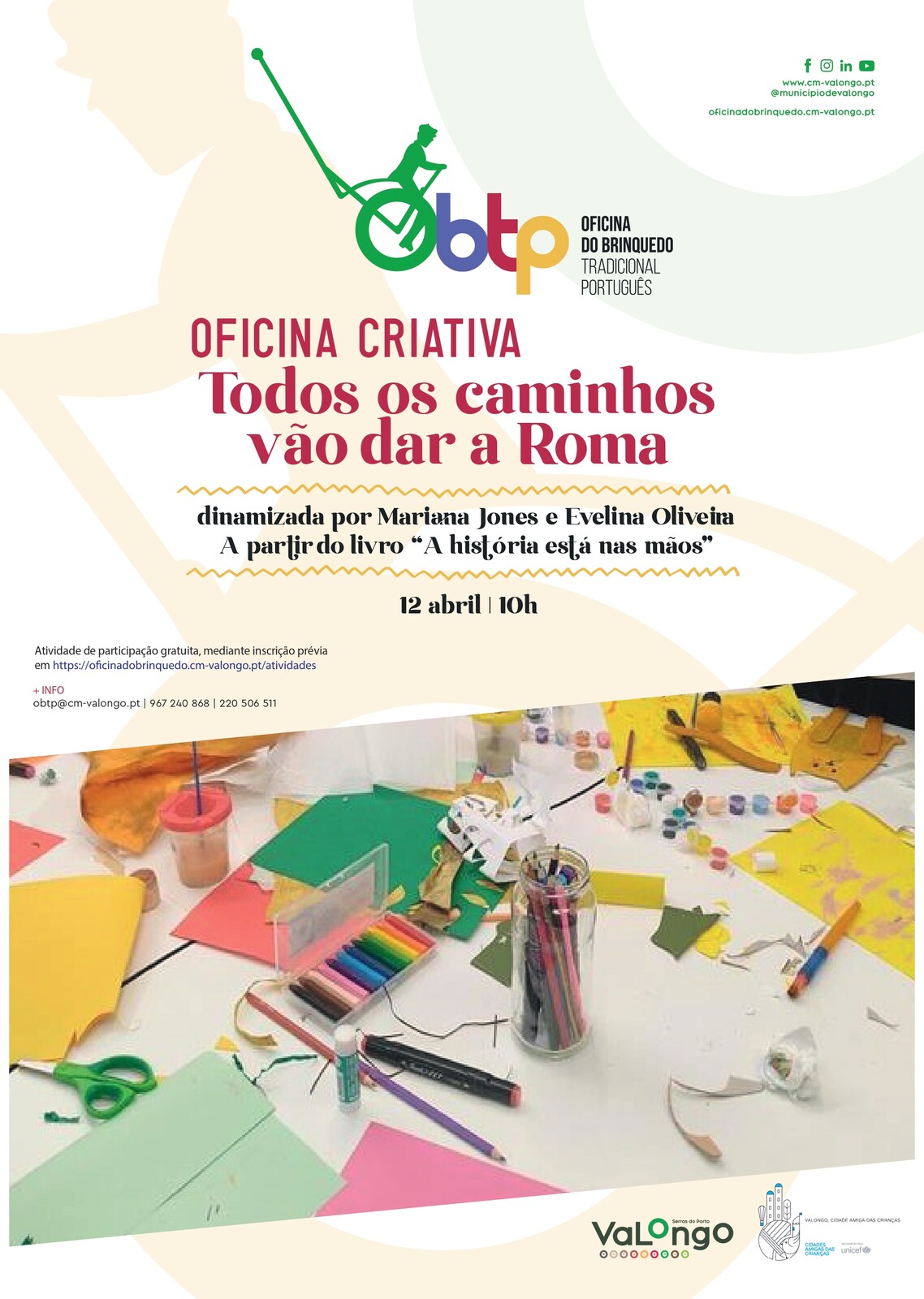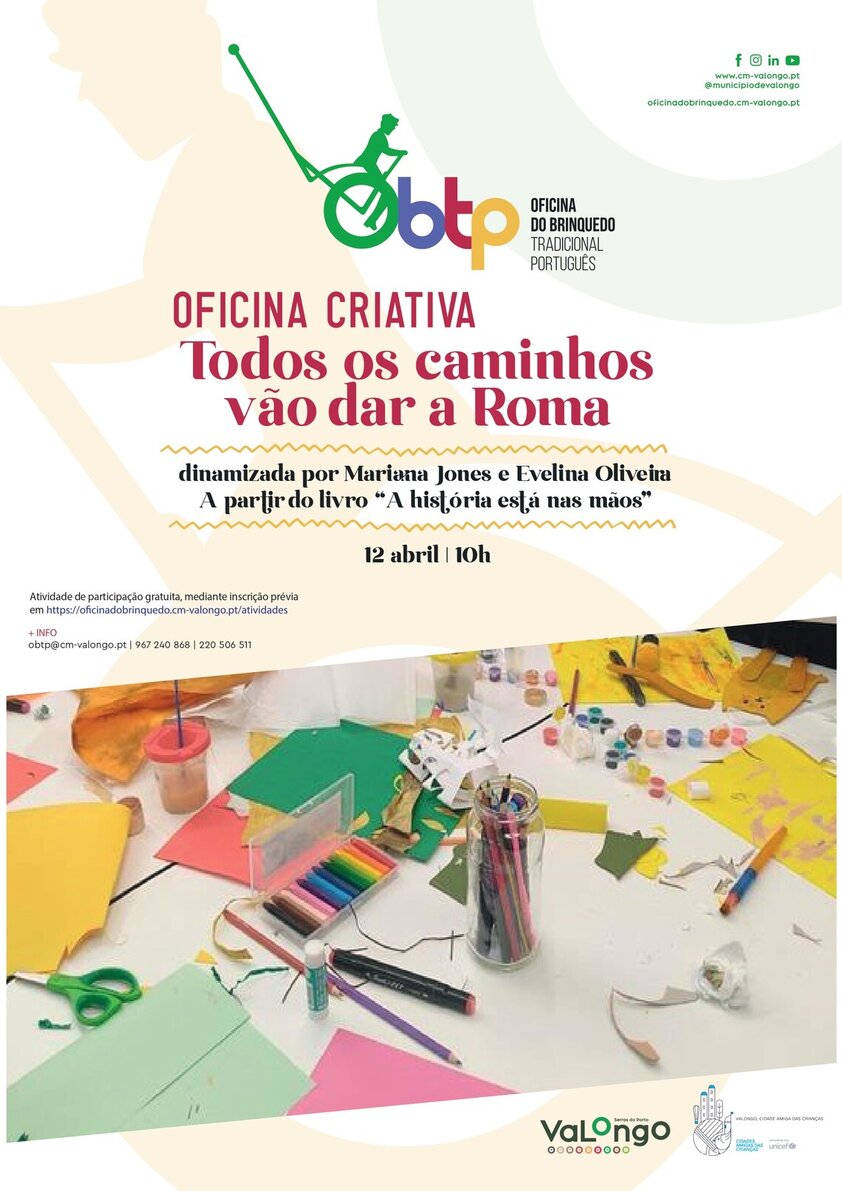 A Oficina do Brinquedo Tradicional Português vai promover a Oficina Criativa "Todos os caminhos vão dar a Roma", dinamizada por Mariana Jones e Evelina Oliveira, no dia 12 de abril, pelas 10h.