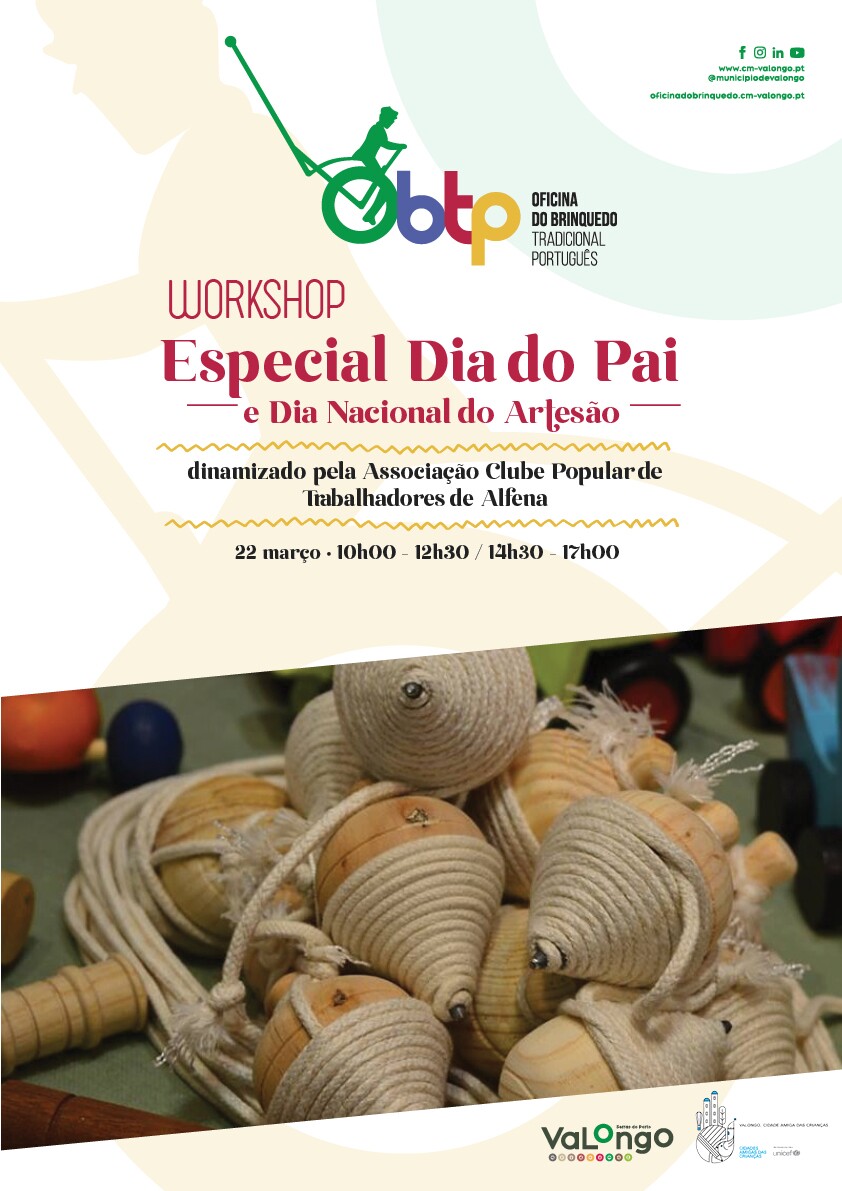 Para celebrar o Dia Nacional do Artesão e, paralelamente, o Dia do Pai, datas assinaladas a 19 de março, a Oficina do Brinquedo Tradicional Português vai promover uma atividade especial, no dia 22 de março, entre as 10h00 e as 17h00, com demonstração de trabalho ao vivo pelo artesão Manuel Marques, que irá produzir os tradicionais rapa, piasca e pião de madeira, prestando, assim, uma homenagem aos artesãos de brinquedos tradicionais em madeira.