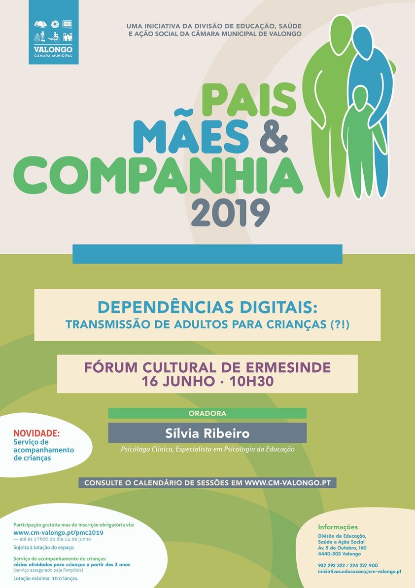 No dia 16 de junho, pelas 10h30, o Fórum Cultural de Ermesinde recebe mais uma sessão do Pais, Mães e Companhia. A edição deste mês será sobre “Dependências Digitais: Transmissão de adultos para crianças(?!)” e terá como oradora convidada Sílvia Maria Ribeiro, Psicóloga Clínica, Especialista em Psicologia da Educação.
