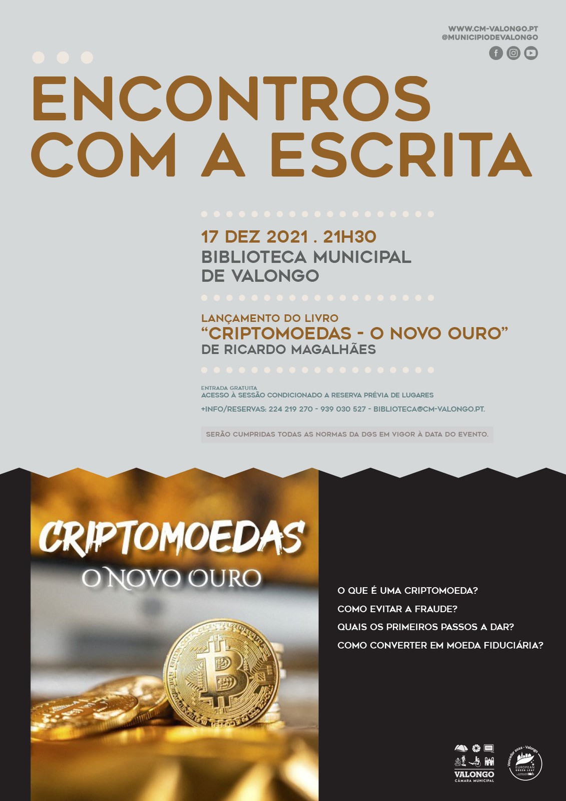 No próximo dia 17 de dezembro (sexta-feira), pelas 21h30, a Biblioteca Municipal de Valongo vai dinamizar mais uma sessão da iniciativa "Encontros com a Escrita", desta vez com o lançamento do livro "Criptomoedas - O Novo Ouro", de Ricardo Magalhães.
