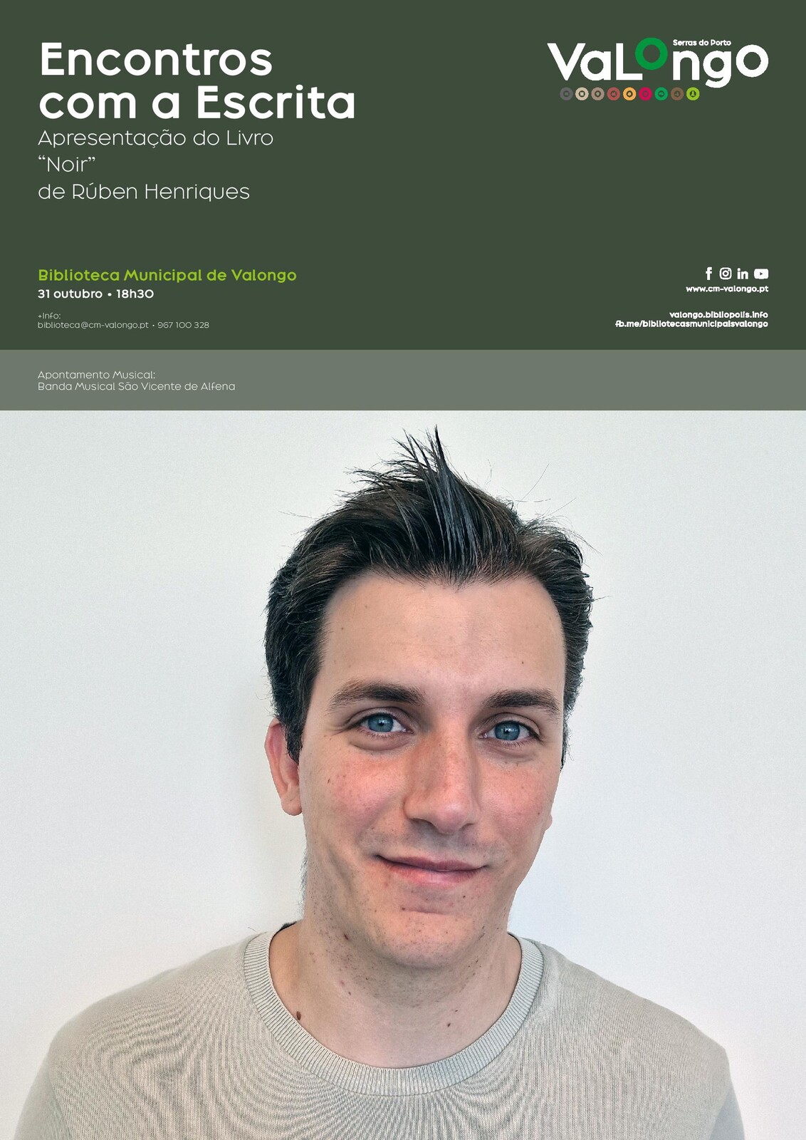Em mais uma edição do Encontros com a Escrita, o escritor Rúben Henriques vem à Biblioteca Municipal de Valongo apresentar o seu livro, "Noir". Será no dia 31 de outubro, pelas 18h30, e contará com um apontamento musical pela Banda Musical de São Vicente de Alfena.