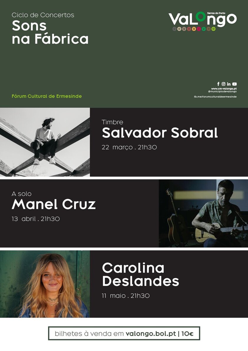 Salvador Sobral é o primeiro convidado de mais um ciclo de concertos "Sons na Fábrica". O intérprete de "Amar pelos dois", vencedor do Festival da Eurovisão em 2017, estará no palco do Fórum Cultural de Ermesinde, no dia 22 de março, pelas 21h30, para apresentar o espetáculo "Timbre". Os bilhetes estarão à venda em valongo.bol.pt a partir das 17h00, do dia 19 de fevereiro.