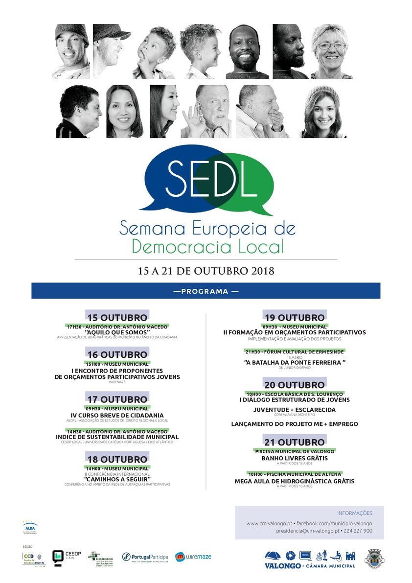 A SEDL - Semana Europeia da Democracia Local é organizada pela Câmara Municipal de Valongo e decorre de 15 a 21 de outubro, reunindo um conjunto de iniciativas diversificadas, tais como conferências, inaugurações, cursos breves, teatro, prática desportiva e exposições.