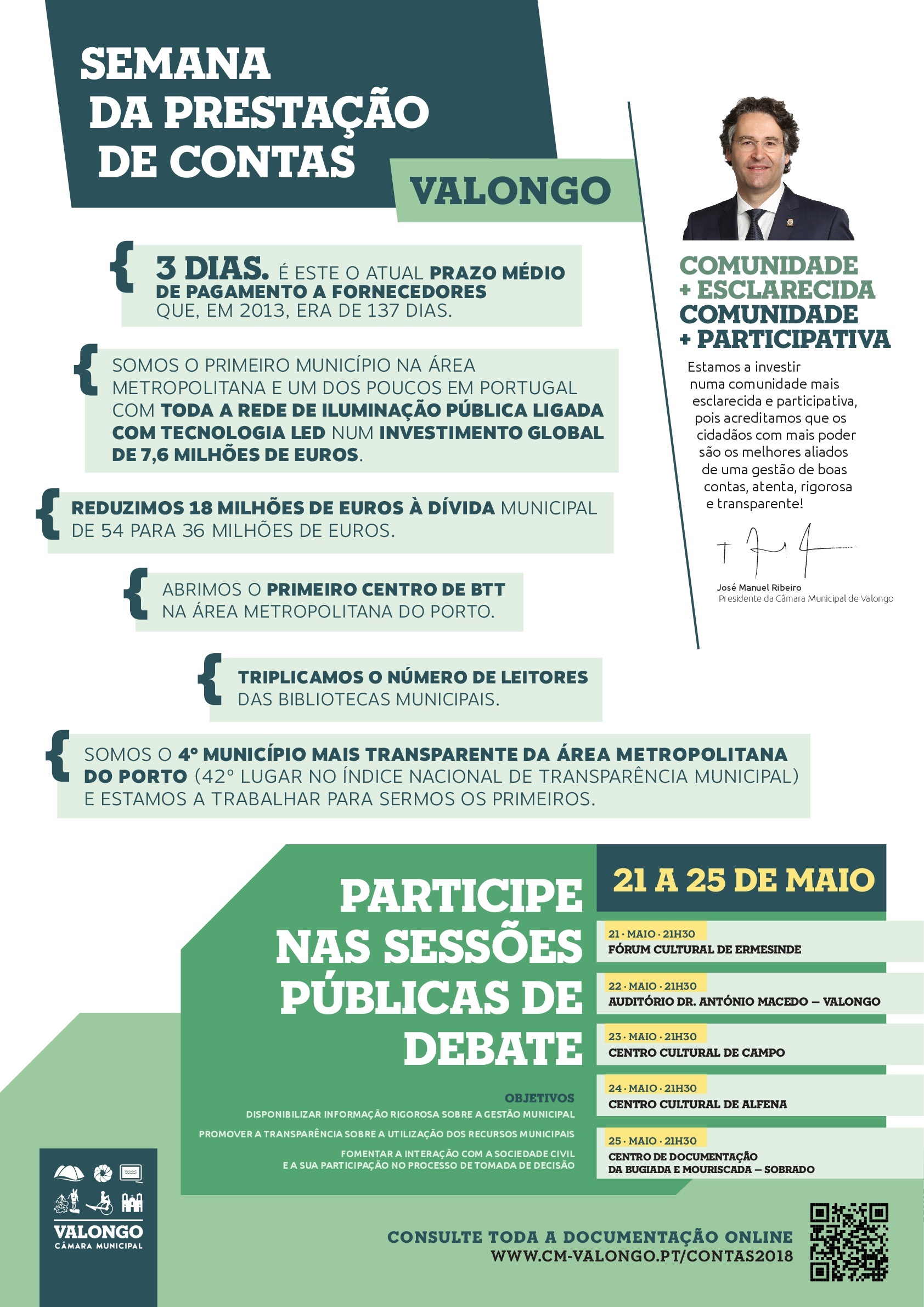 “Estamos a investir numa comunidade mais esclarecida e participativa, pois acreditamos que os cidadãos com mais poder são os melhores aliados de uma gestão de boas contas, atenta, rigorosa e transparente”, sublinha o Presidente da Câmara Municipal de Valongo, José Manuel Ribeiro.