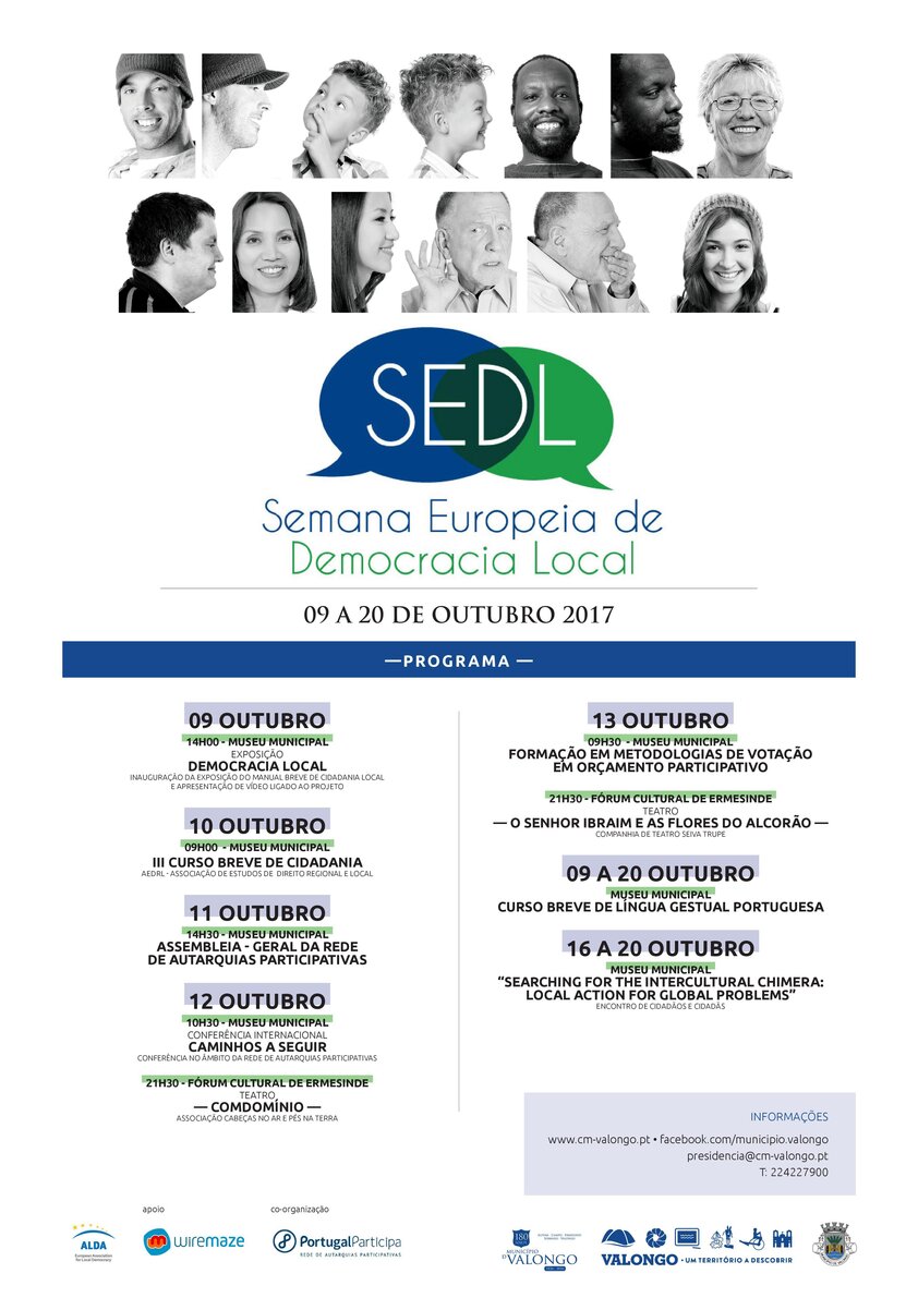 A SEDL - Semana Europeia da Democracia Local é organizada pela Câmara Municipal de Valongo e decorre de 09 a 20 de outubro, reunindo um conjunto de iniciativas diversificadas, tais como conferências, cursos breves, teatro e exposições.