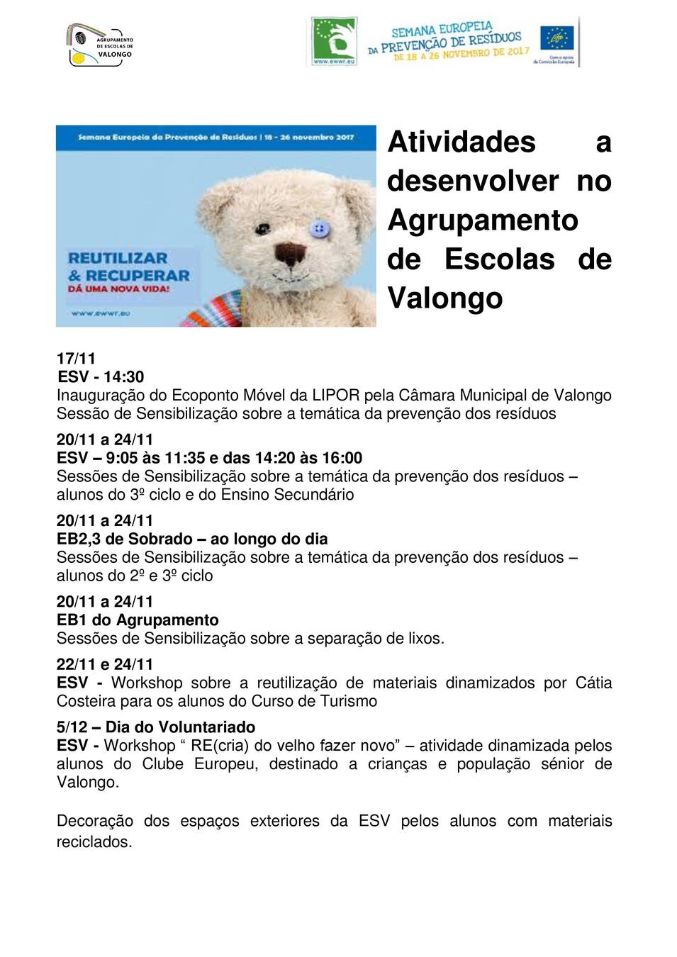 - No sentido de sensibilizar a comunidade escolar de Valongo para a correta separação de resíduos a Câmara Municipal, com o apoio da LIPOR, vai dinamizar a itinerância do Ecoponto Móvel LIPOR. Esta iniciativa, que tem como público-alvo os estabelecimentos de ensino, na Escola Básica e Secundária de Campo, decorre entre os dias 17 e 27 de Novembro, no âmbito da EWWR - Semana Europeia da Prevenção de Resíduos e tem como tema principal - Reutilização e Recuperação: Dá-lhe uma nova vida!