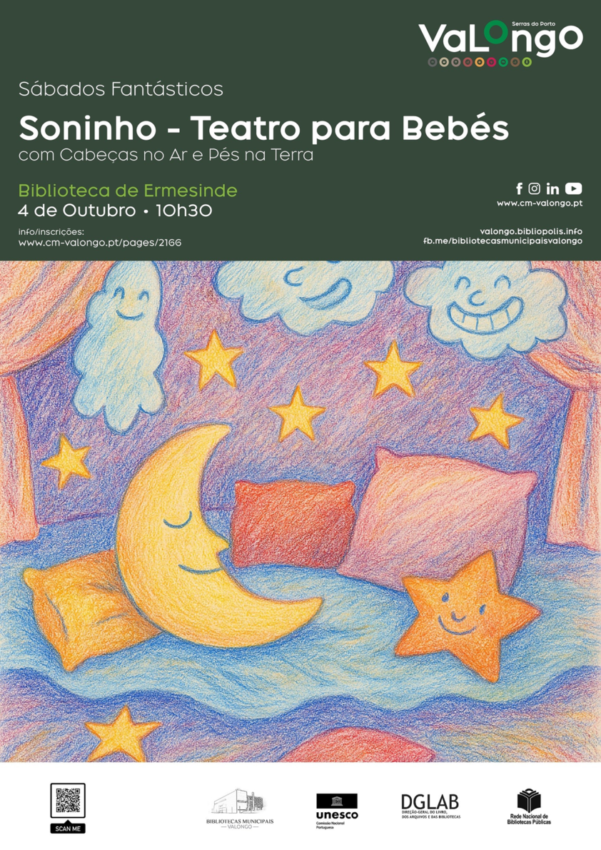 A Biblioteca de Ermesinde, na Vila Beatriz, vai ser palco da próxima edição do sábados fantásticos. No dia 04 de outubro, às 10h30, o grupo Cabeças no Ar e Pés na Terra apresenta "Soninho - Teatro para Bebés".