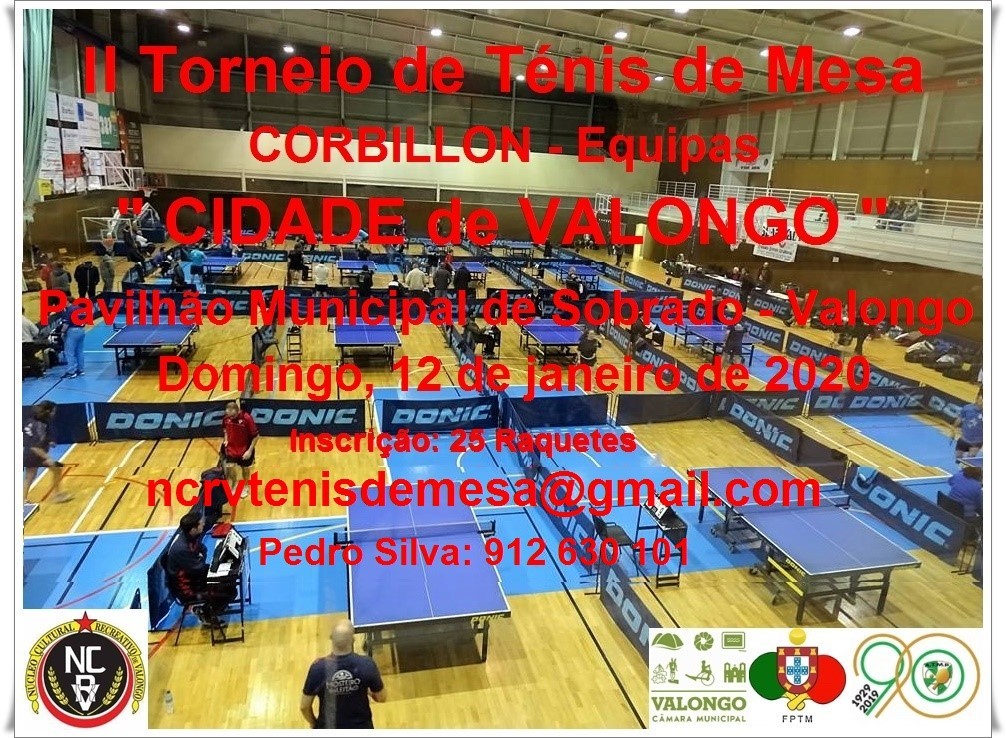 O Núcleo Cultural e Recreativo de Valongo vai realizar, com o apoio da Câmara Municipal de Valongo, 2 Torneios de Ténis de Mesa, no fim de semana de 11 e 12 de janeiro de 2020, a partir das 9h00, no Pavilhão Municipal de Sobrado.
