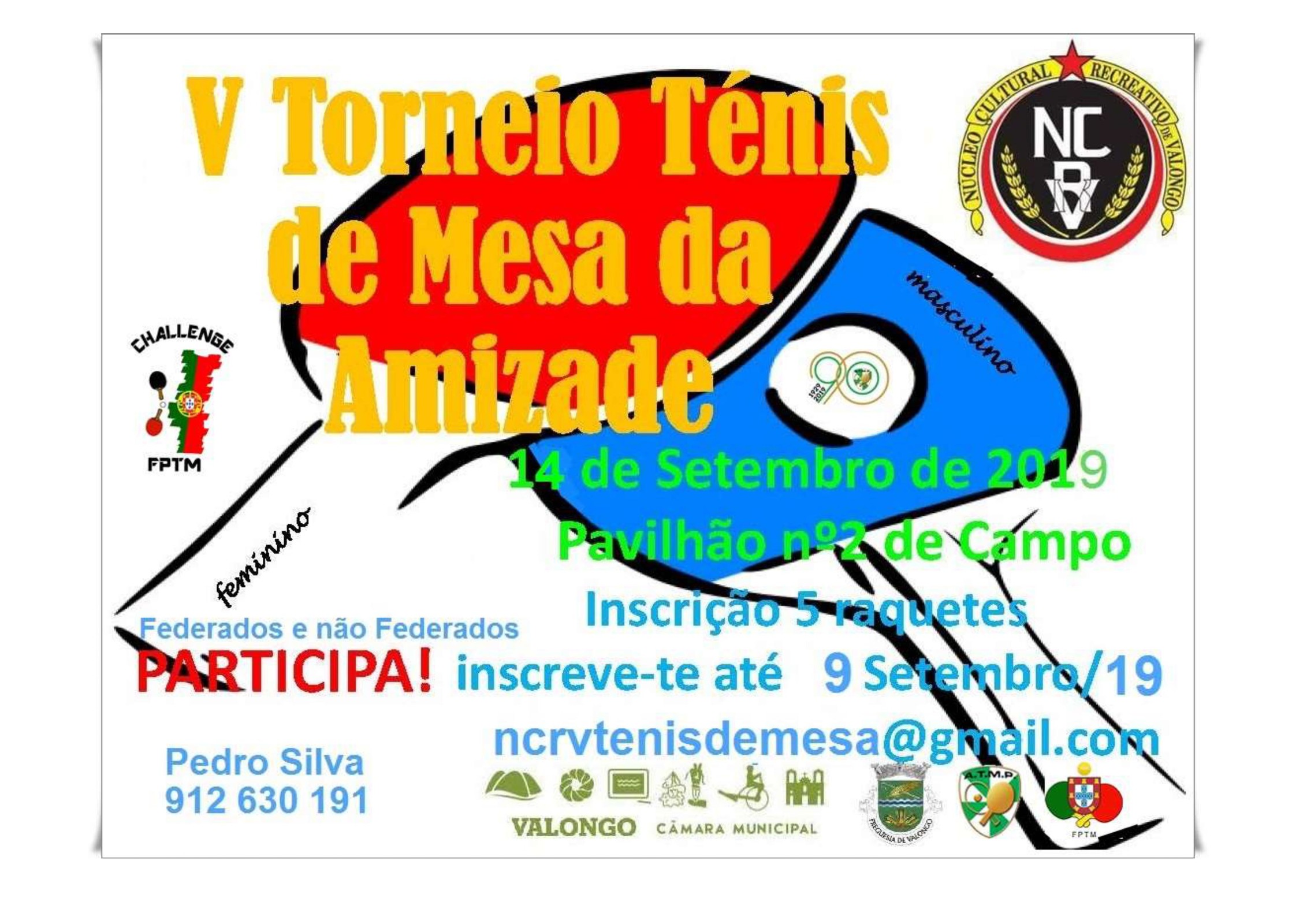 O Núcleo Cultural e Recreativo de Valongo, com o apoio do município de Valongo, vai realizar no próximo dia 14 de setembro, no Pavilhão Municipal n.º 2 de Campo, a 5.ª edição do Torneio da Amizade “Cidade de Valongo”, em prol do desenvolvimento da modalidade de Ténis de Mesa.