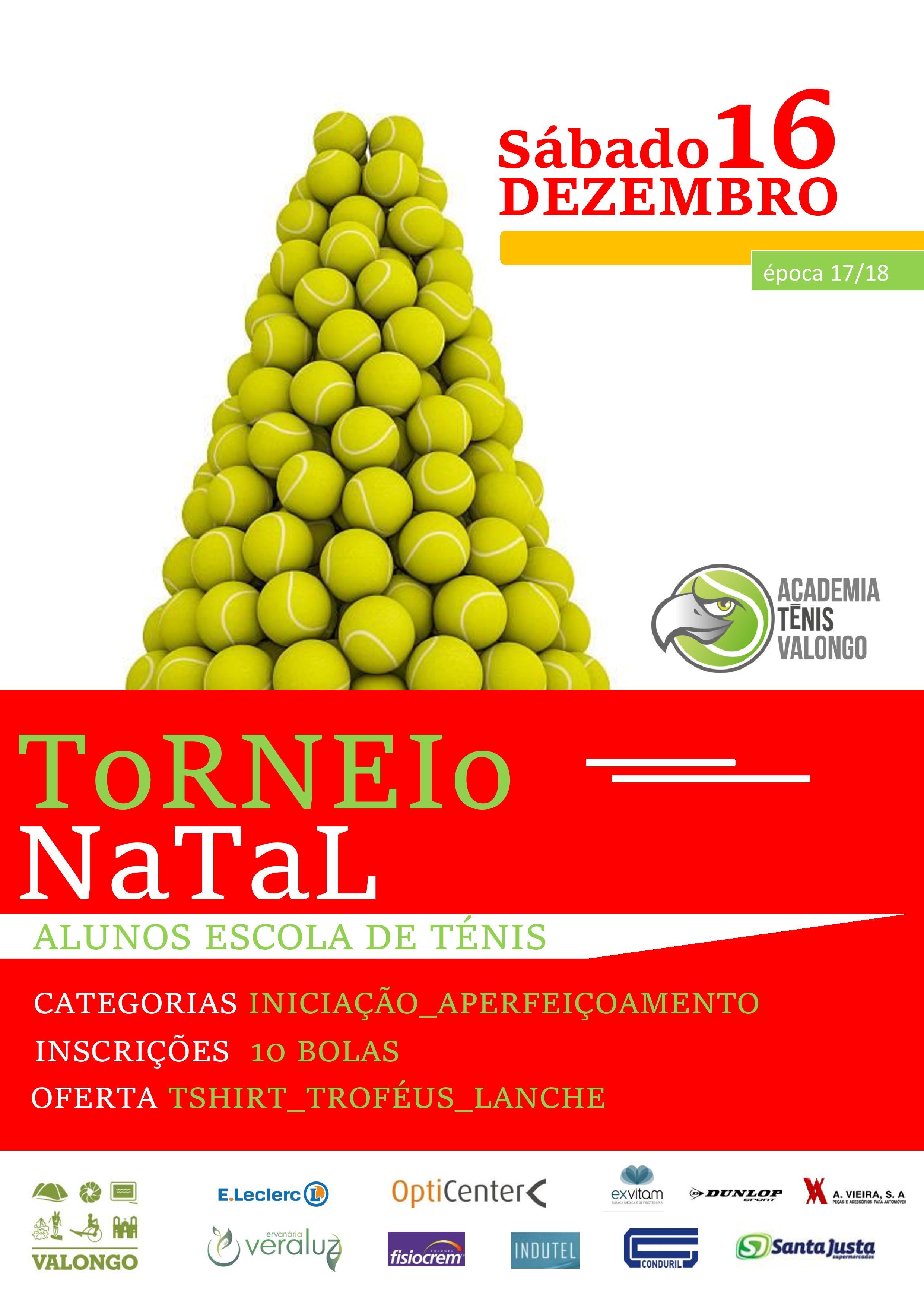 A Academia de Ténis de Valongo - ATV, irá realizar um Torneio de Natal, no dia 16 de dezembro, nas instalações da Academia, a partir das 9h00, com o objetivo da Celebração da Quadra Festiva que atravessamos e também promover a competição e o convívio entre os alunos mais jovens da ATV.