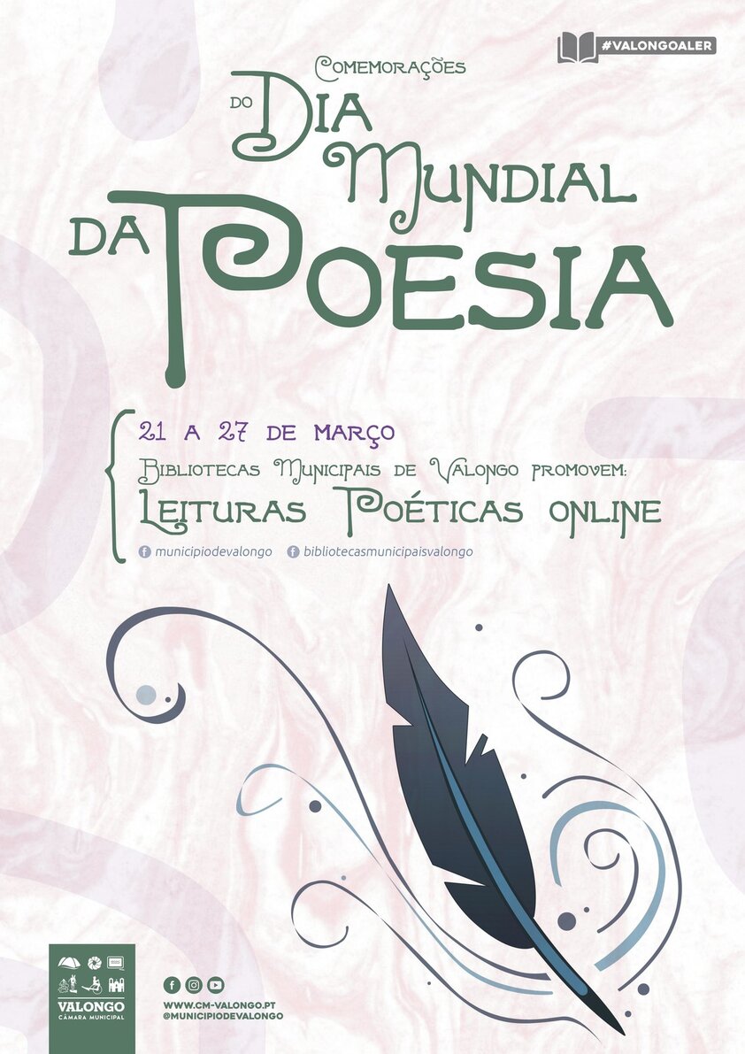 No próximo domingo, 21 de março, assinala-se o Dia Mundial da Poesia e a Câmara Municipal de Valongo vai, como habitualmente, comemorar a data. Assim, ao longo de uma semana, entre 21 e 27 de março, no facebook da autarquia e das bibliotecas de Valongo, decorrerão sessões de leitura poética online que estarão a cargo de um conjunto de personalidades do concelho. Com esta iniciativa pretende-se homenagear poetas, reviver tradições orais de recitais de poesia e promover a leitura,