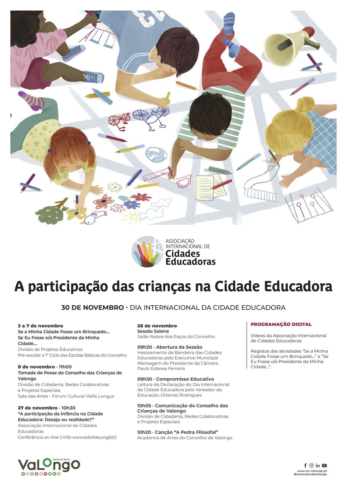Este ano, sob o tema “A participação das crianças na Cidade Educadora”, serão promovidas diversas atividades que dão voz aos mais novos e incentivam a sua intervenção ativa na construção de uma comunidade mais justa, solidária e participativa.