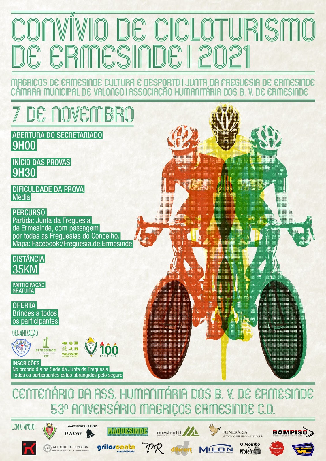 A Associação Magriços de Ermesinde Cultura e Desporto, em coorganização com a Associação Humanitária dos Bombeiros Voluntários de Ermesinde, o Município de Valongo e a Junta de Freguesia de Ermesinde, vai realizar a 17.ª edição do Passeio de Cicloturismo de Ermesinde. A prova decorrerá no dia 07 de novembro, com partida pelas 9h00, junto ao edifício da Junta de Freguesia de Ermesinde e chegada nas instalações dos Bombeiros Voluntários de Ermesinde, tendo passagem pelas restantes freguesias do concelho. Esta iniciativa está inserida nas Comemorações do 53.º Aniversário da coletividade e no 100.º Aniversário dos Bombeiros Voluntários de Ermesinde.