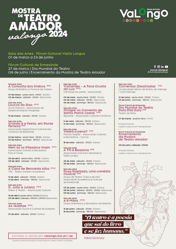 Nesta página encontra a agenda de todos os eventos organizados pelo Município de Valongo ou com o apoio deste. Poderá procurar por um evento específico na barra de pesquisa abaixo apresentada ou percorrendo as diversas páginas onde os eventos se encontram ordenados cronologicamente. Poderá também consultar a agenda cultural disponível em https://www.cm-valongo.pt/valongoemagenda