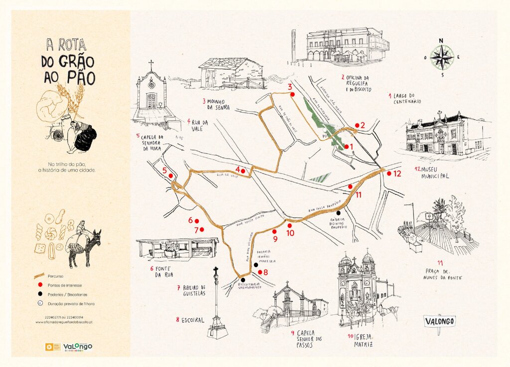 Ao longo do trajeto, o visitante acompanha a transformação do grão em pão, passando pelo antigo moinho, pelas padarias e biscoitarias tradicionais e pela histórica estrada real, que tantas valongueiras trilharam a caminho da cidade do Porto.