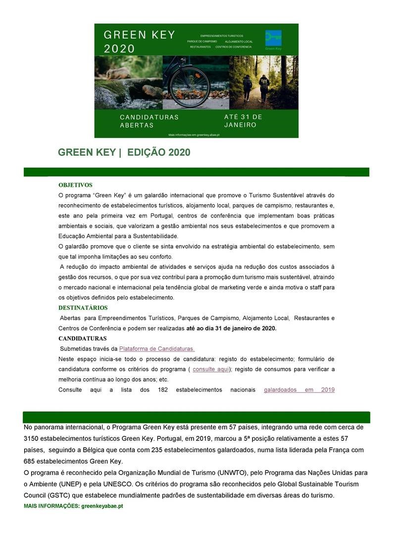 Abertura de candidaturas ao programa GREEN KEY I EDIÇÃO 2020 (galardão internacional que promove o Turismo Sustentável).