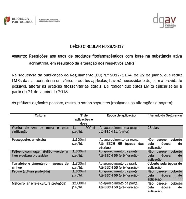Restrições aos usos de produtos fitofarmacêuticos com base na substância ativa acrinatrina, em resultado da alteração dos respetivos LMRs