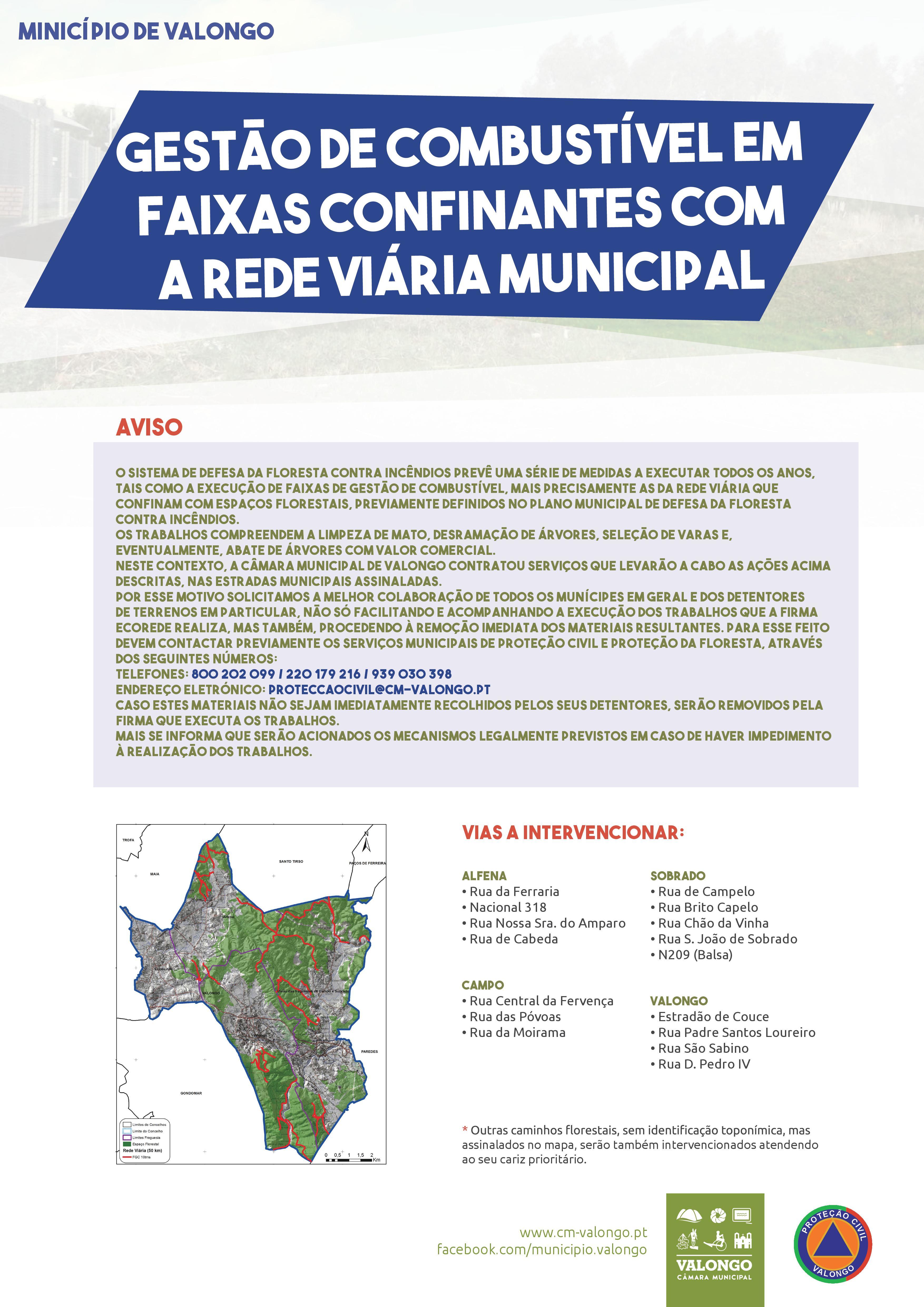 Por esse motivo solicitamos a melhor colaboração de todos os munícipes em geral e dos detentores de terrenos em particular, não só facilitando e acompanhando a execução dos trabalhos que a Firma ECOREDE realiza, mas também, procedendo à remoção imediata dos materiais resultantes. Para esse feito devem contactar previamente os Serviços Municipais de Proteção Civil e Proteção da Floresta, através dos seguintes números: